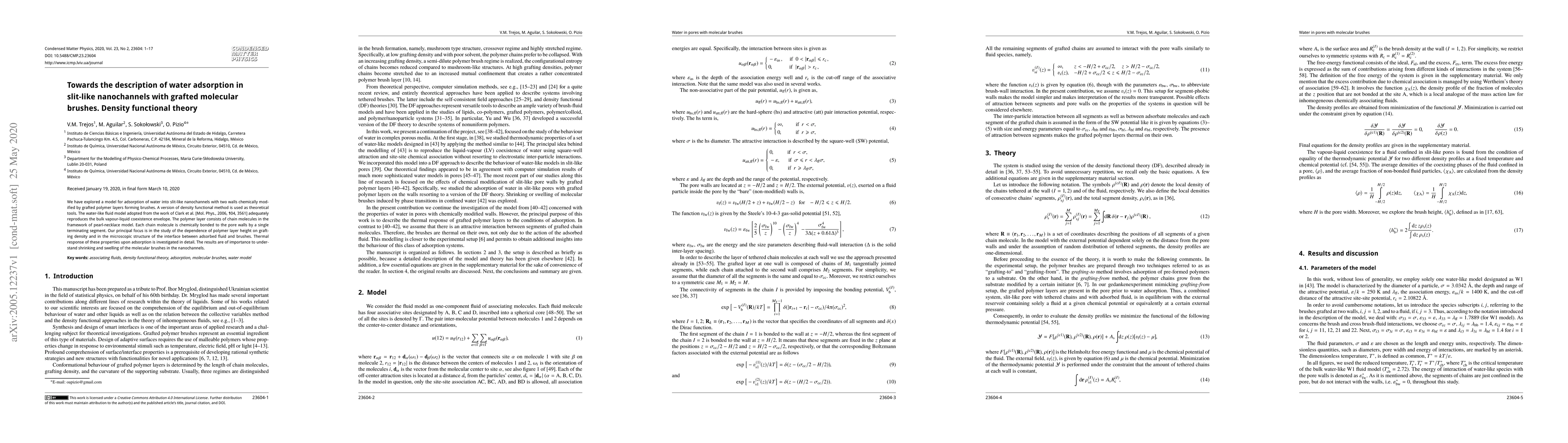 We have explored a model for adsorption of water into slit-like nanochannels with two walls chemically modified by grafted polymer layers forming brushes. A version of density functional method is used as theoretical tools. The water-like fluid model adopted from the work of Clark et al. [Mol. Phys., 2006, 104, 3561] adequately reproduces the bulk vapour-liquid coexistence envelope. The polymer layer consists of chain molecules in the framework of pearl-necklace model. Each chain molecule is chemically bonded to the pore walls by a single terminating segment. Our principal focus is in the study of the dependence of polymer layer height on grafting density and in the microscopic structure of the interface between adsorbed fluid and brushes. Thermal response of these properties upon adsorption is investigated in detail. The results are of importance to understand shrinking and swelling of the molecular brushes in the nanochannels.