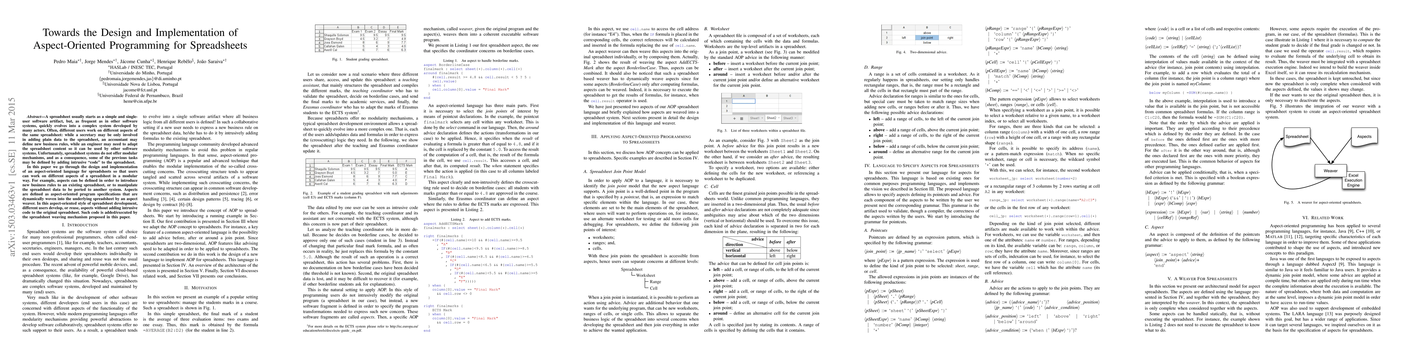 The paper presents an aspect-oriented language for spreadsheets, including a pointcut model and advice declarations, along with a dynamic weaver integrated with a spreadsheet execution engine.