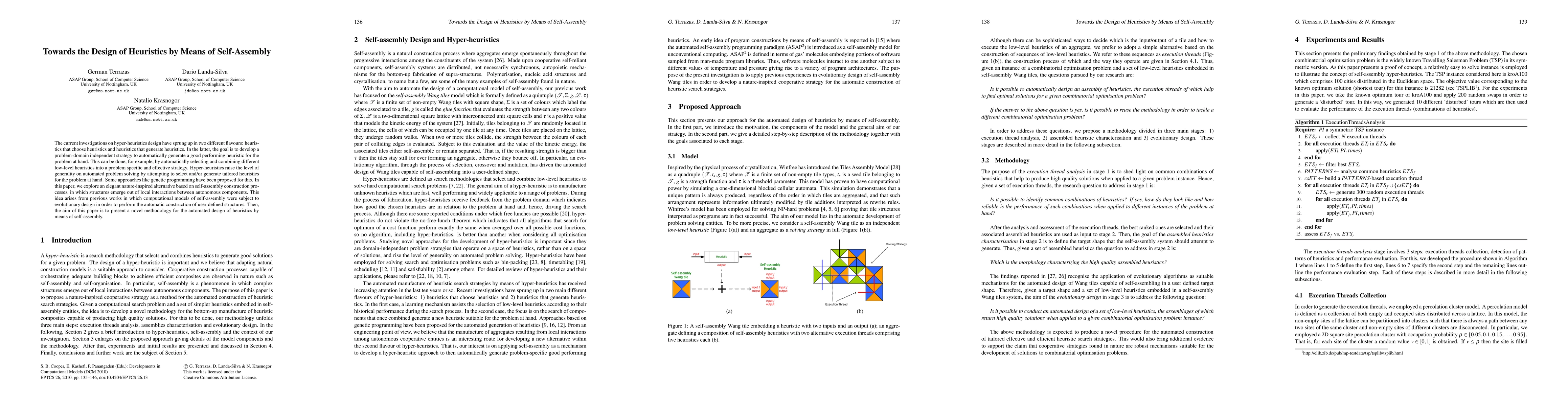 This paper proposes a novel methodology for automated heuristic design using self-assembly principles, inspired by nature, to create problem-specific strategies through local interactions of autonomous components, offering an alternative to existing hyper-heuristic approaches.
