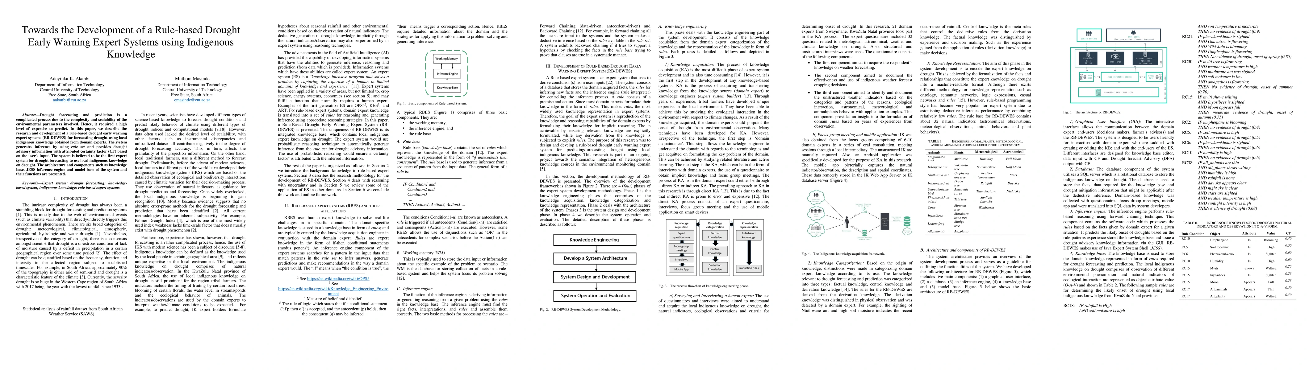 This paper develops a rule-based drought early warning expert system (RB-DEWES) that leverages local indigenous knowledge for drought forecasting. The system uses a rule set and an inference engine to provide drought advisories with certainty factors based on user inputs.