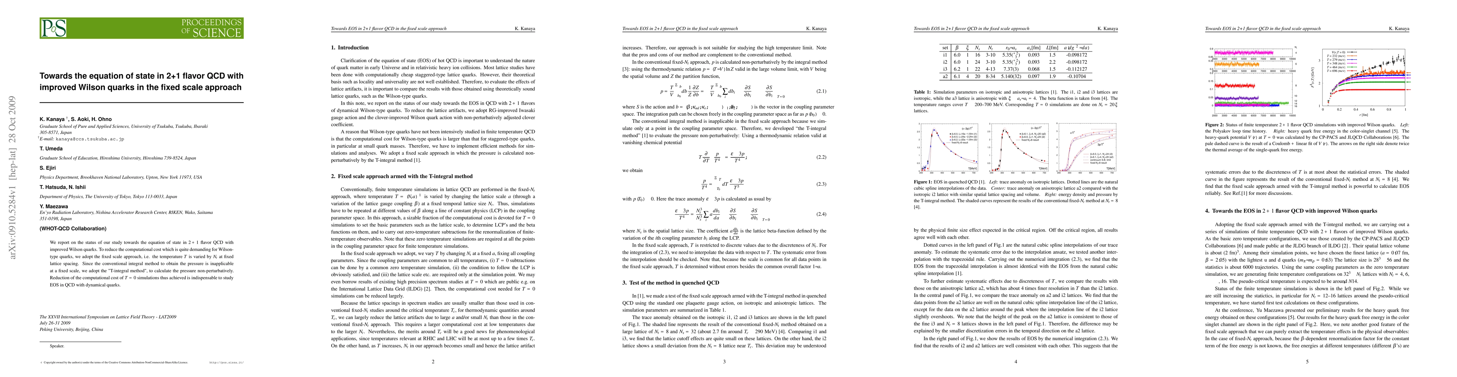 We report on the status of our study towards the equation of state in 2+1 flavor QCD with improved Wilson quarks. To reduce the computational cost which is quite demanding for Wilson-type quarks, we adopt the fixed scale approach, i.e. the temperature T is varied by N_t at fixed lattice spacing. Since the conventional integral method to obtain the pressure is inapplicable at a fixed scale, we adopt the "T-integral method", to calculate the pressure non-perturbatively. Reduction of the computational cost of T=0 simulations thus achieved is indispensable to study EOS in QCD with dynamical quarks.