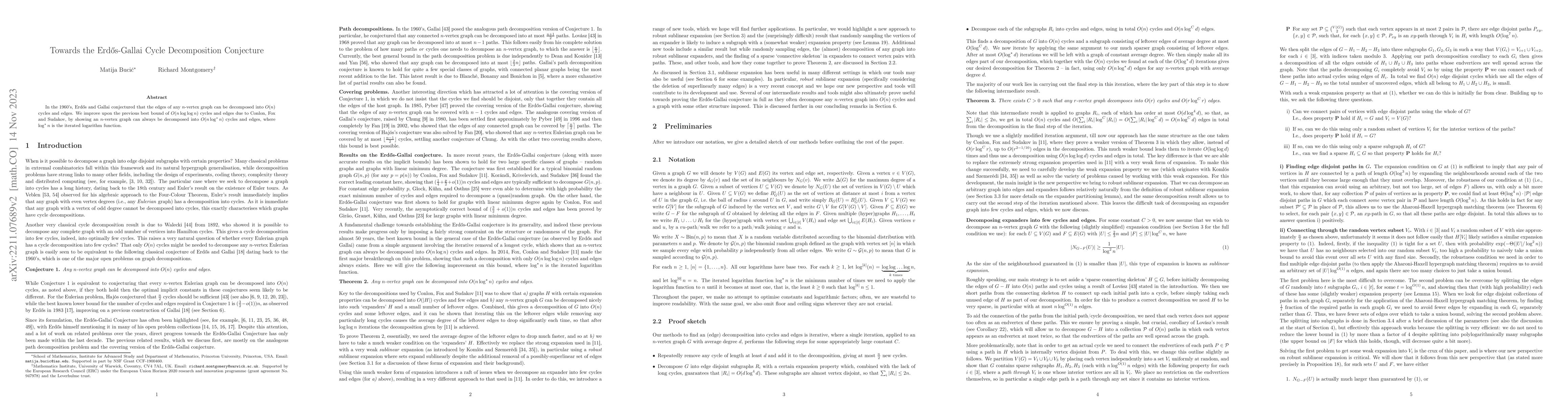 In the 1960's, Erd\H{o}s and Gallai conjectured that the edges of any $n$-vertex graph can be decomposed into $O(n)$ cycles and edges. We improve upon the previous best bound of $O(n\log\log n)$ cycles and edges due to Conlon, Fox and Sudakov, by showing an $n$-vertex graph can always be decomposed into $O(n\log^{*}n)$ cycles and edges, where $\log^{*}n$ is the iterated logarithm function.