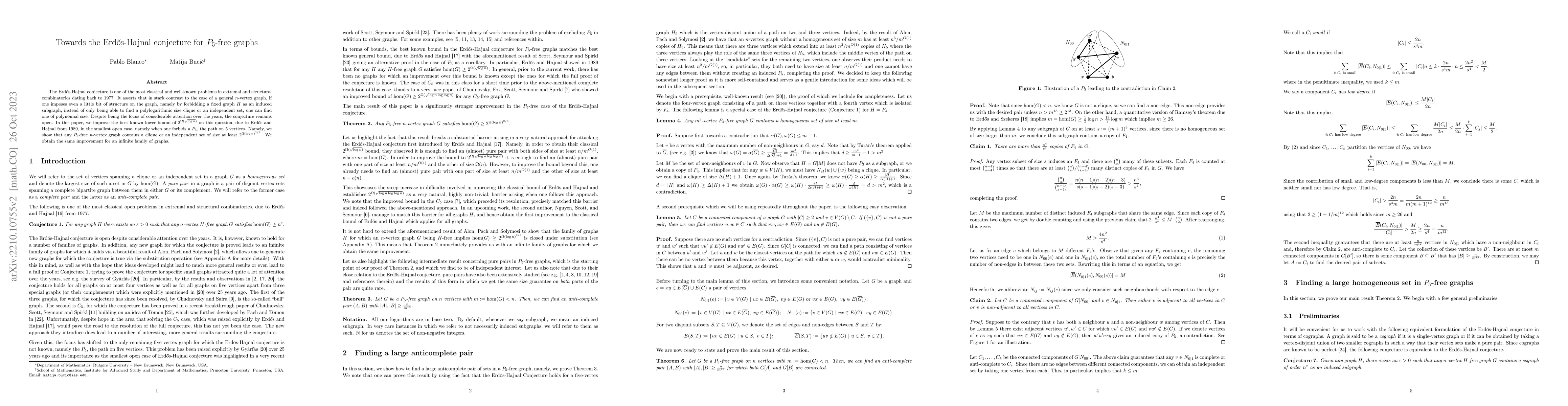 The Erd\H{o}s-Hajnal conjecture is one of the most classical and well-known problems in extremal and structural combinatorics dating back to 1977. It asserts that in stark contrast to the case of a general $n$-vertex graph if one imposes even a little bit of structure on the graph, namely by forbidding a fixed graph $H$ as an induced subgraph, instead of only being able to find a polylogarithmic size clique or an independent set one can find one of polynomial size. Despite being the focus of considerable attention over the years the conjecture remains open. In this paper we improve the best known lower bound of $2^{\Omega(\sqrt{\log n})}$ on this question, due to Erd\H{o}s and Hajnal from 1989, in the smallest open case, namely when one forbids a $P_5$, the path on $5$ vertices. Namely, we show that any $P_5$-free $n$ vertex graph contains a clique or an independent set of size at least $2^{\Omega(\log n)^{2/3}}$. Our methods also lead to the same improvement for an infinite family of graphs.