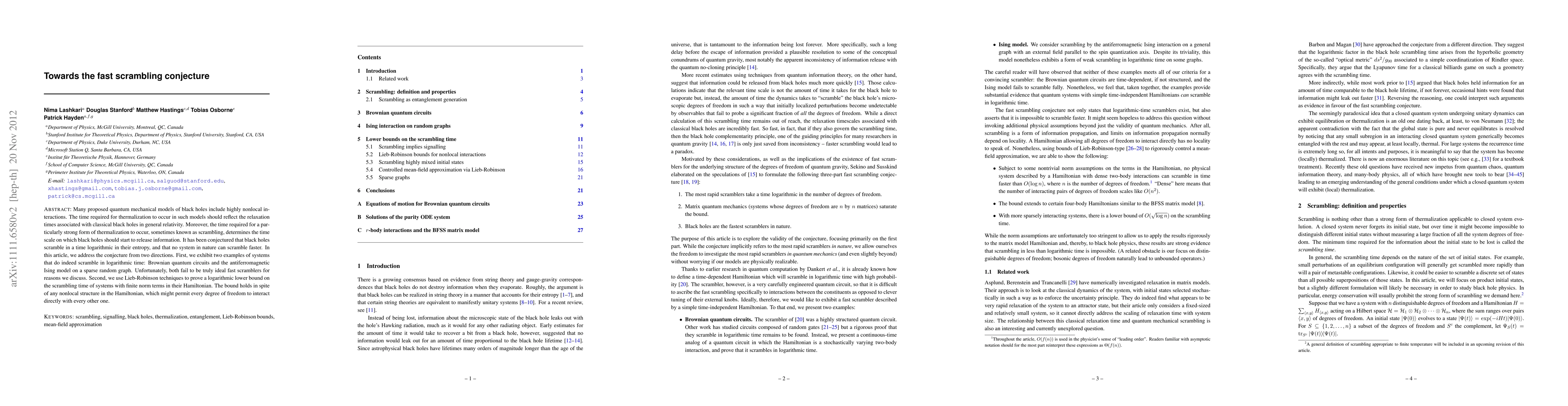 This paper explores the fast scrambling conjecture in quantum mechanical models of black holes, presenting examples of systems that scramble in logarithmic time and proving a logarithmic lower bound on scrambling time for systems with finite norm terms in their Hamiltonian, regardless of nonlocal interactions.