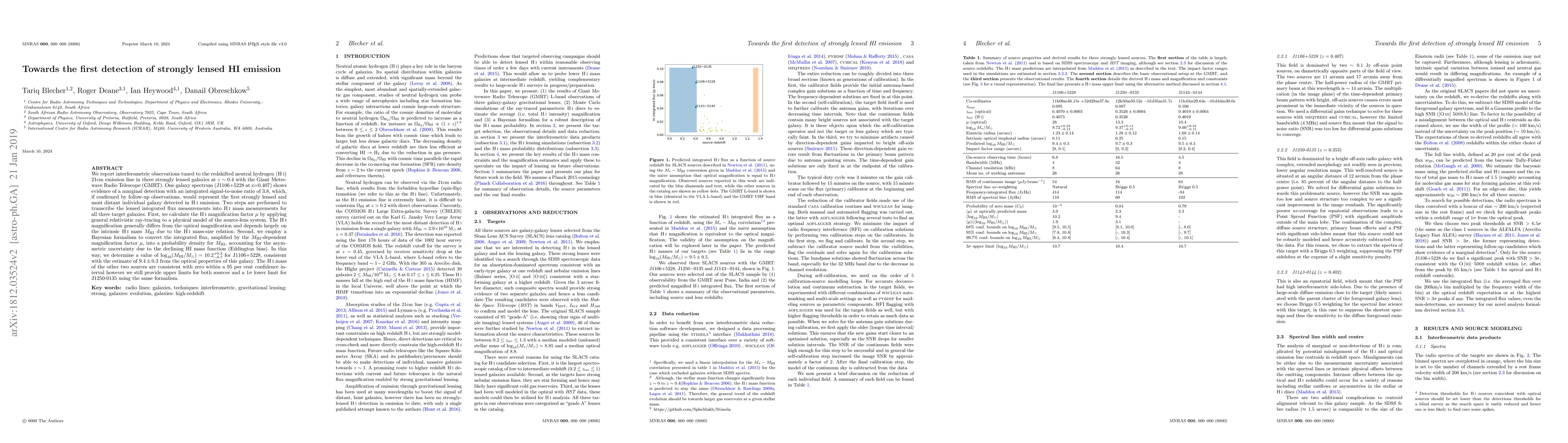 This paper reports interferometric observations of neutral hydrogen (HI) emission in three strongly lensed galaxies, with a marginal detection in one galaxy (J1106+5228). The study employs general relativistic ray-tracing and Bayesian formalism to estimate HI masses, finding a value of $\log_{10} (M_{\rm HI}/M_\odot) = 10.2^{+0.3}_{-0.7}$ for J1106+5228, consistent with optical estimates.