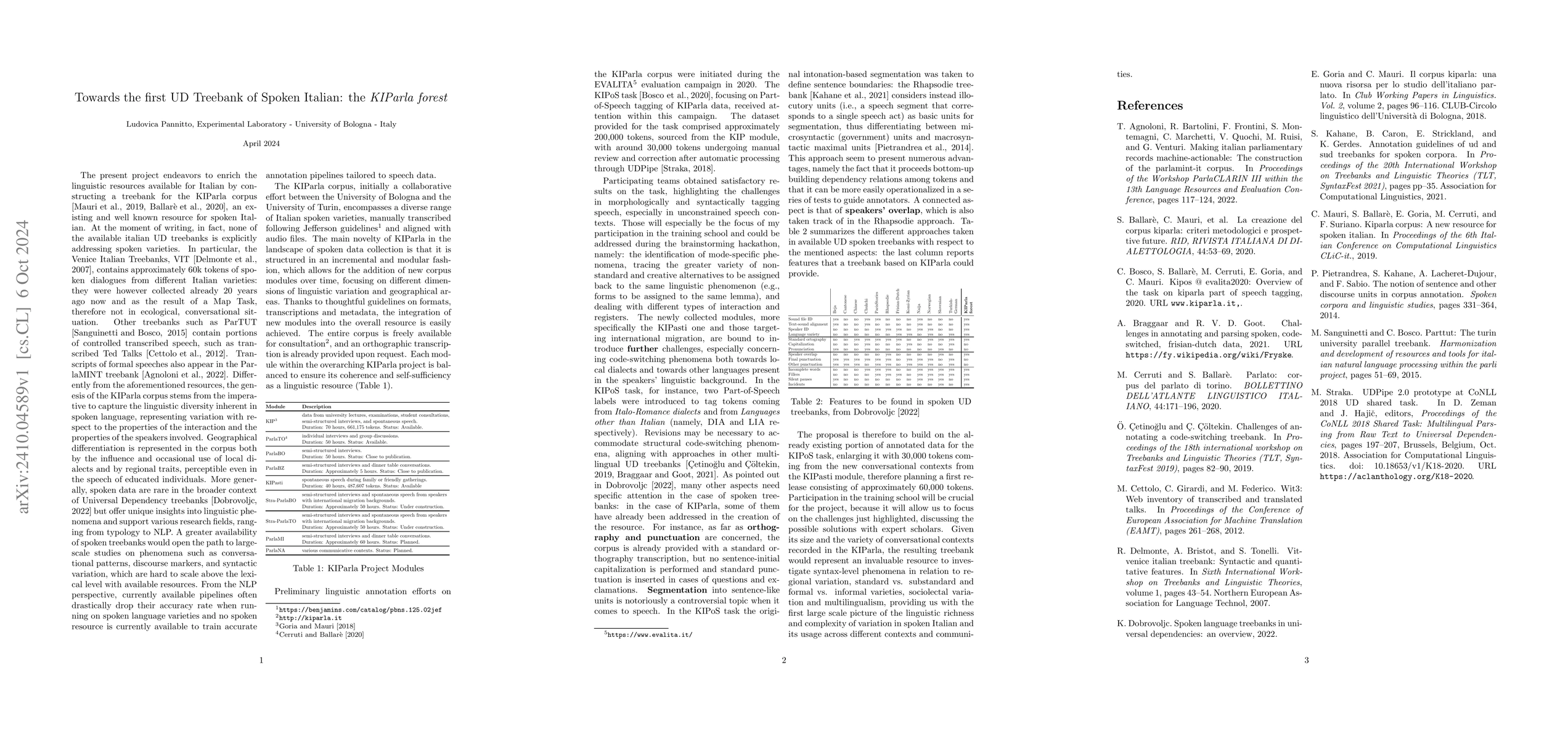 This paper aims to create a Universal Dependencies treebank for the KIParla corpus, enhancing linguistic resources for spoken Italian and utilizing existing data for this purpose. The project seeks to contribute significantly to computational linguistics through this new resource.