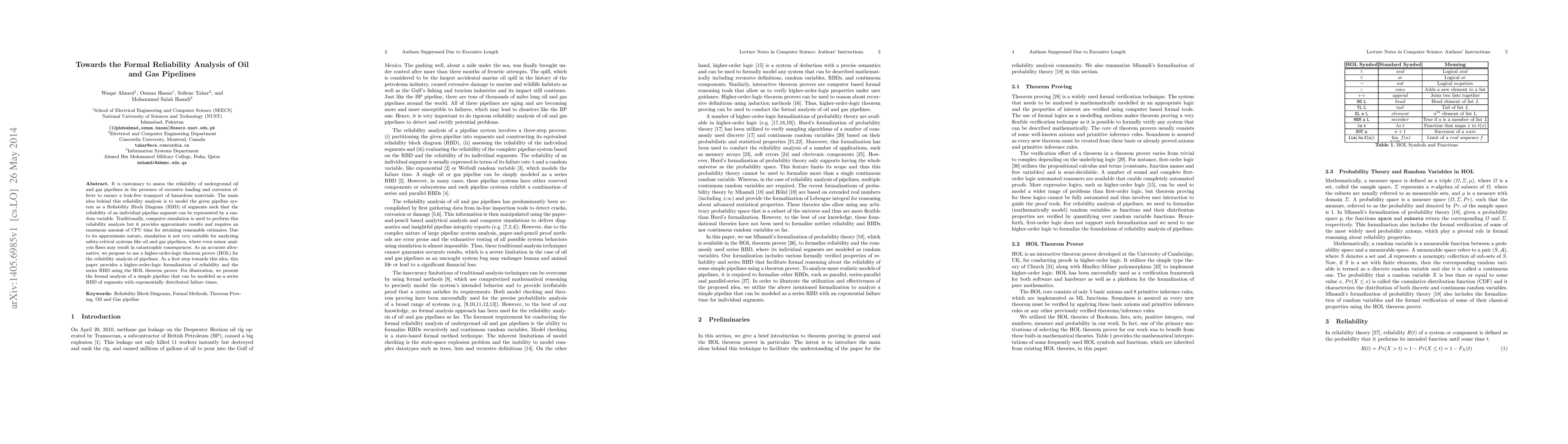 This paper proposes using a higher-order-logic theorem prover (HOL) for formal reliability analysis of oil and gas pipelines, aiming for more precise results than traditional simulation methods. It presents a HOL formalization of reliability and series Reliability Block Diagrams (RBD) to model pipeline segments with exponentially distributed failure times.