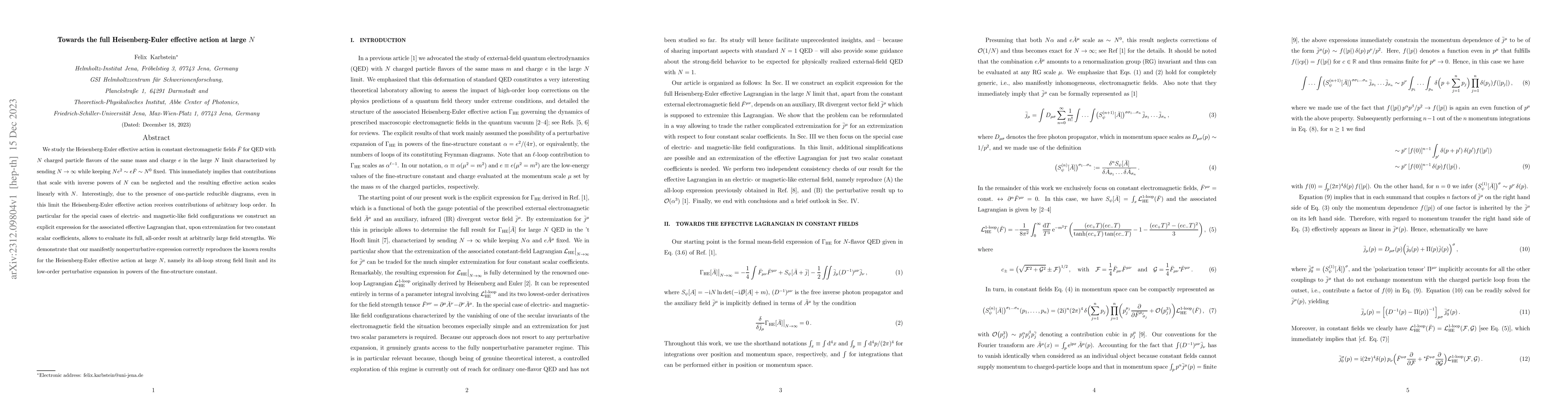 This paper investigates the Heisenberg-Euler effective action in QED for large $N$ charged particle flavors, demonstrating that the action scales linearly with $N$ and receives contributions of arbitrary loop order. The authors construct an explicit expression for the effective Lagrangian that accurately reproduces known results for the all-loop strong field limit and low-order perturbative expansions.