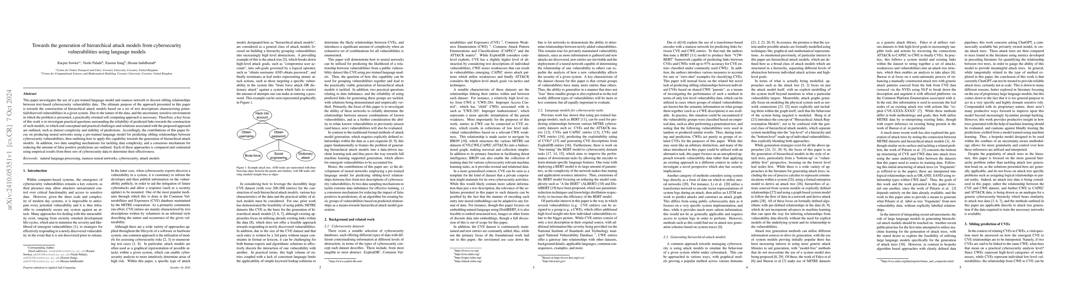 This paper develops a method using a pre-trained language model and siamese network to identify relationships between cybersecurity vulnerabilities, aiming to construct hierarchical attack models. It also proposes strategies to address data complexity and false positives, evaluated through empirical results on multiple cybersecurity datasets.
