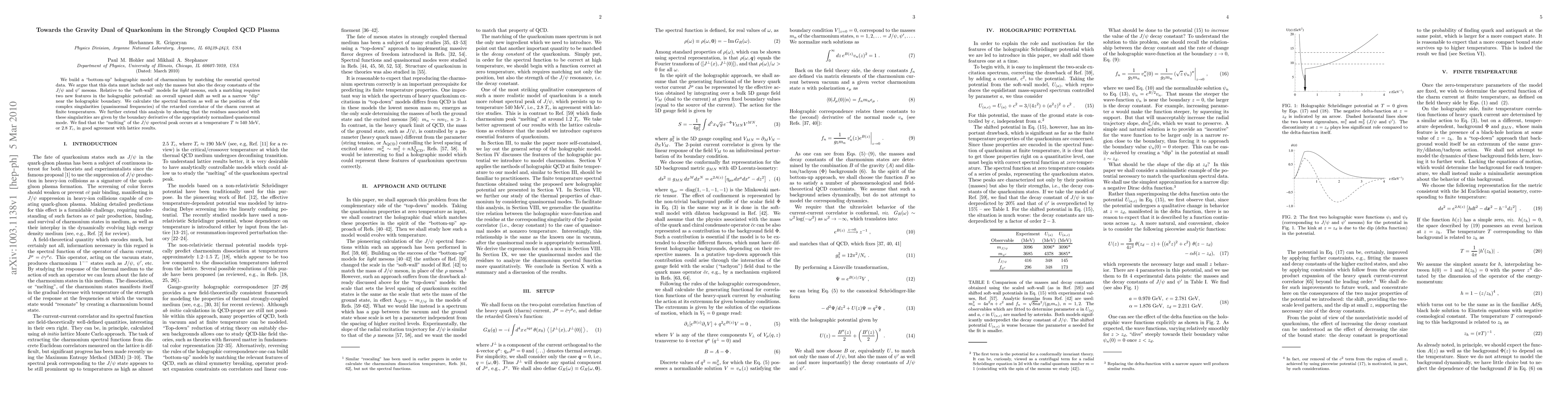 We build a "bottom-up" holographic model of charmonium by matching the essential spectral data. We argue that this data must include not only the masses but also the decay constants of the J/psi and psi' mesons. Relative to the "soft-wall" models for light mesons, such a matching requires two new features in the holographic potential: an overall upward shift as well as a narrow "dip" near the holographic boundary. We calculate the spectral function as well as the position of the complex singularities (quasinormal frequencies) of the retarded correlator of the charm current at finite temperatures. We further extend this analysis by showing that the residues associated with these singularities are given by the boundary derivative of the appropriately normalized quasinormal mode. We find that the "melting" of the J/psi spectral peak occurs at a temperature of about 540 MeV, or 2.8 T_c, in good agreement with lattice results.