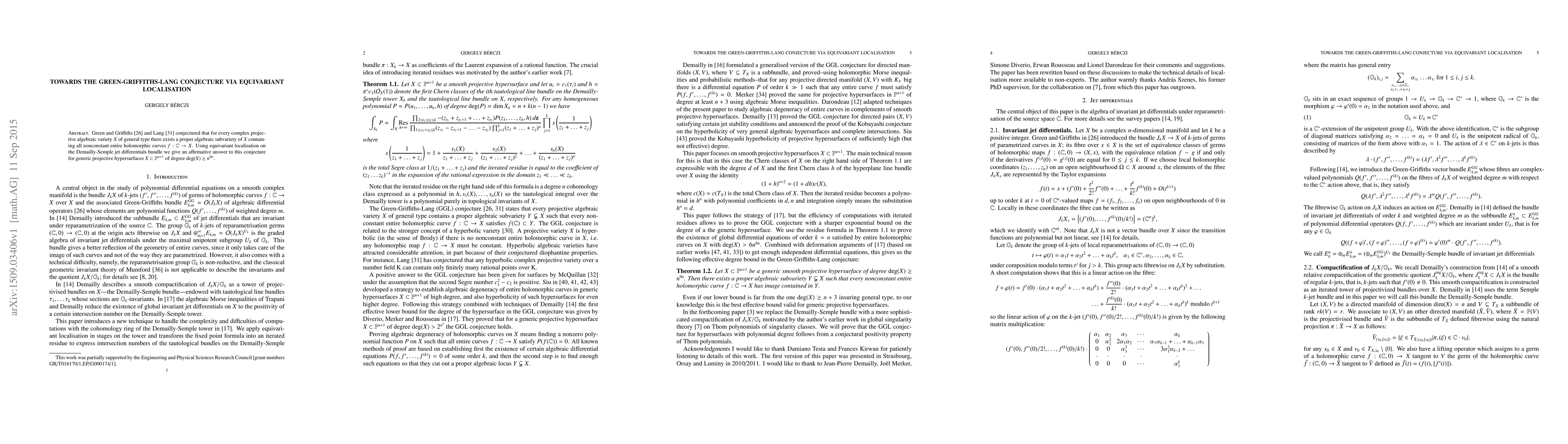 The Green-Griffiths-Lang conjecture posits that complex projective varieties of general type contain proper subvarieties encompassing all nonconstant entire holomorphic curves. The paper affirms this conjecture for generic high-degree projective hypersurfaces using equivariant localisation on the Demailly-Semple jet differentials bundle.