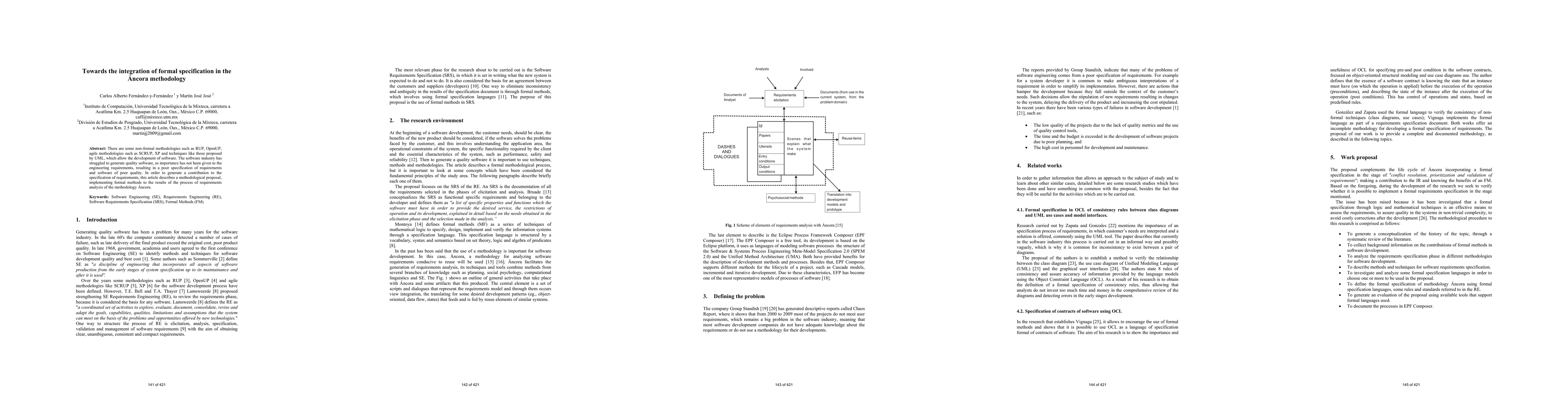 There are some non-formal methodologies such as RUP, OpenUP, agile methodologies such as SCRUP, XP and techniques like those proposed by UML, which allow the development of software. The software industry has struggled to generate quality software, as importance has not been given to the engineering requirements, resulting in a poor specification of requirements and software of poor quality. In order to generate a contribution to the specification of requirements, this article describes a methodological proposal, implementing formal methods to the results of the process of requirements analysis of the methodology \'Ancora.