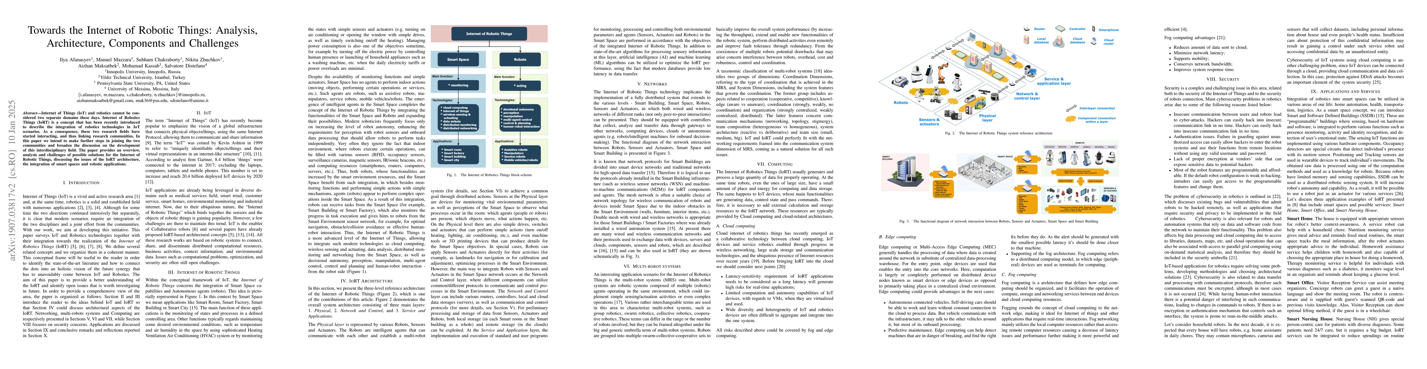 This paper explores the integration of robotics technologies within the Internet of Things (IoT) to form the Internet of Robotic Things (IoRT), analyzing its architecture, components, and challenges. It aims to bridge research communities and discusses the issues surrounding smart spaces and robotic applications in this emerging interdisciplinary field.