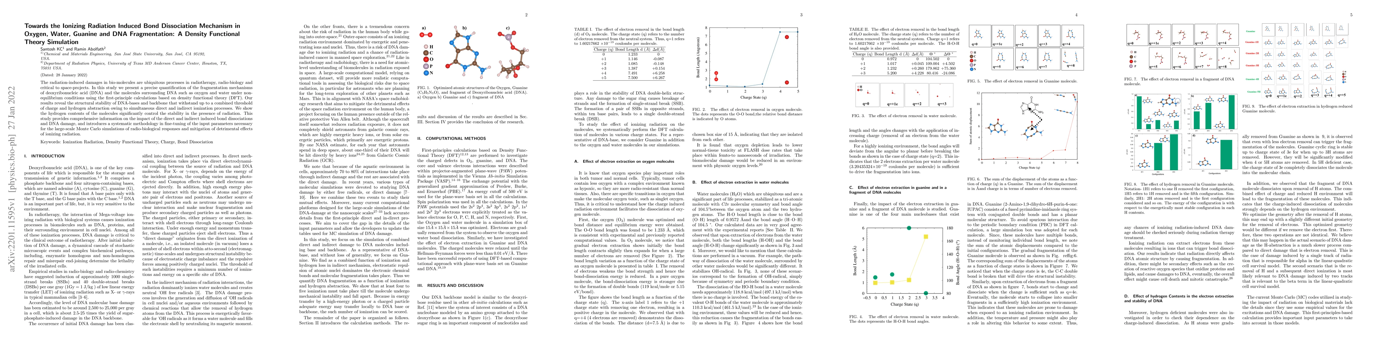 The radiation-induced damages in bio-molecules are ubiquitous processes in radiotherapy, radio-biology and critical to space-projects. In this study we present a precise quantification of the fragmentation mechanisms of deoxyribonucleic acid (DNA) and the molecules surrounding DNA such as oxygen and water under non-equilibrium conditions using the first-principle calculations based on density functional theory (DFT). Our results reveal the structural stability of DNA-bases and backbone that withstand up to a combined threshold of charge and hydrogen abstraction owing to simultaneous direct and indirect ionization processes. We show the hydrogen contents of the molecules significantly control the stability in the presence of radiation. This study provides comprehensive information on the impact of the direct and indirect induced bond dissociations and DNA damage, and introduces a systematic methodology in fine-tuning of the input parameters necessary for the large-scale Monte Carlo simulations of radio-biological responses and mitigation of detrimental effects of ionizing radiation.