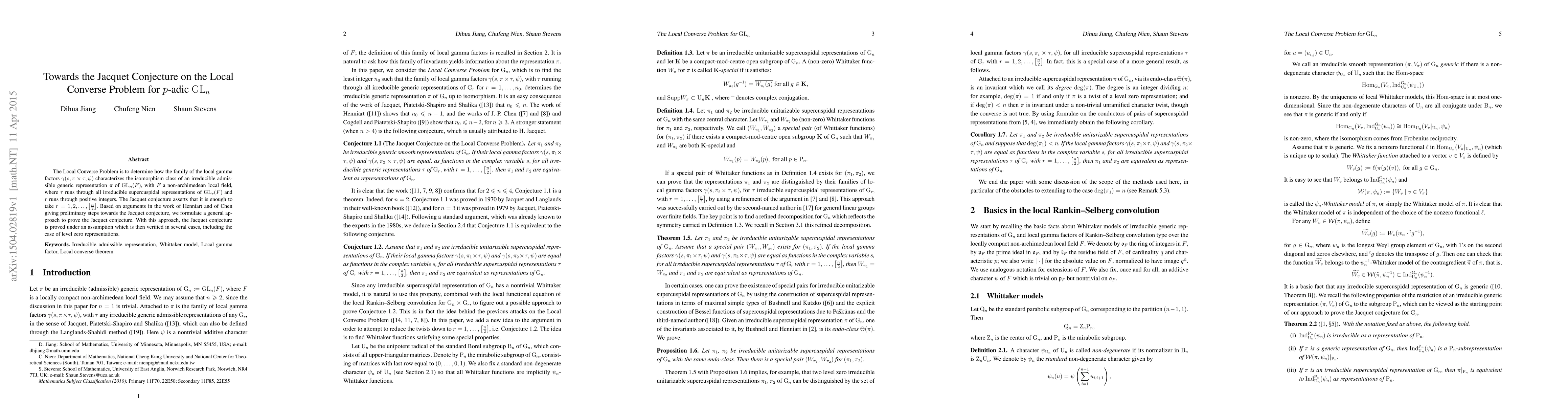 The Local Converse Problem is to determine how the family of the local gamma factors $\gamma(s,\pi\times\tau,\psi)$ characterizes the isomorphism class of an irreducible admissible generic representation $\pi$ of $\mathrm{GL}_n(F)$, with $F$ a non-archimedean local field, where $\tau$ runs through all irreducible supercuspidal representations of $\mathrm{GL}_r(F)$ and $r$ runs through positive integers. The Jacquet conjecture asserts that it is enough to take $r=1,2,\ldots,\left[\frac{n}{2}\right]$. Based on arguments in the work of Henniart and of Chen giving preliminary steps towards the Jacquet conjecture, we formulate a general approach to prove the Jacquet conjecture. With this approach, the Jacquet conjecture is proved under an assumption which is then verified in several cases, including the case of level zero representations.
