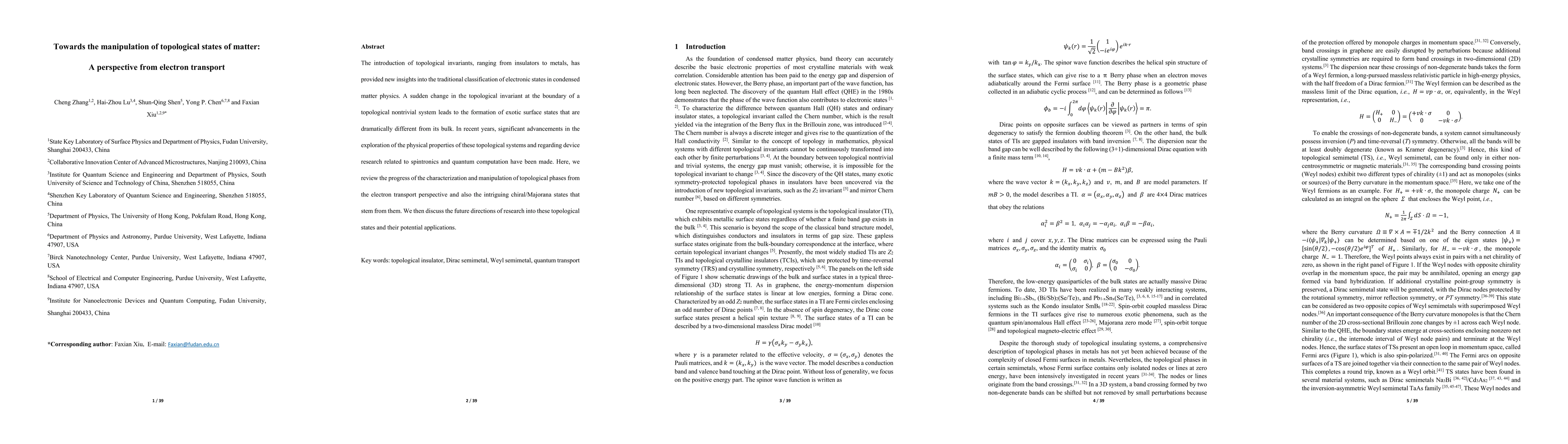 This paper reviews progress in understanding and controlling topological states of matter via electron transport, highlighting advancements in characterizing these exotic states and their potential for spintronics and quantum computing. It also discusses future research directions and applications.