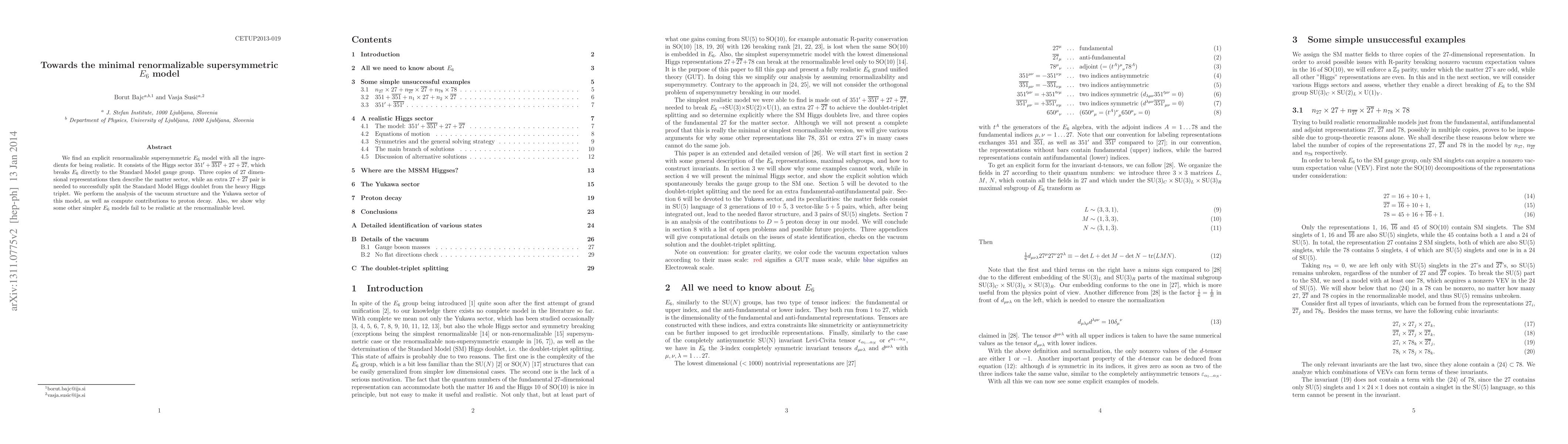 We find an explicit renormalizable supersymmetric $E_6$ model with all the ingredients for being realistic. It consists of the Higgs sector $351'+\overline{351'}+27+\overline{27}$, which breaks $E_6$ directly to the Standard Model gauge group. Three copies of $27$ dimensional representations then describe the matter sector, while an extra $27+\overline{27}$ pair is needed to successfully split the Standard Model Higgs doublet from the heavy Higgs triplet. We perform the analysis of the vacuum structure and the Yukawa sector of this model, as well as compute contributions to proton decay. Also, we show why some other simpler $E_6$ models fail to be realistic at the renormalizable level.