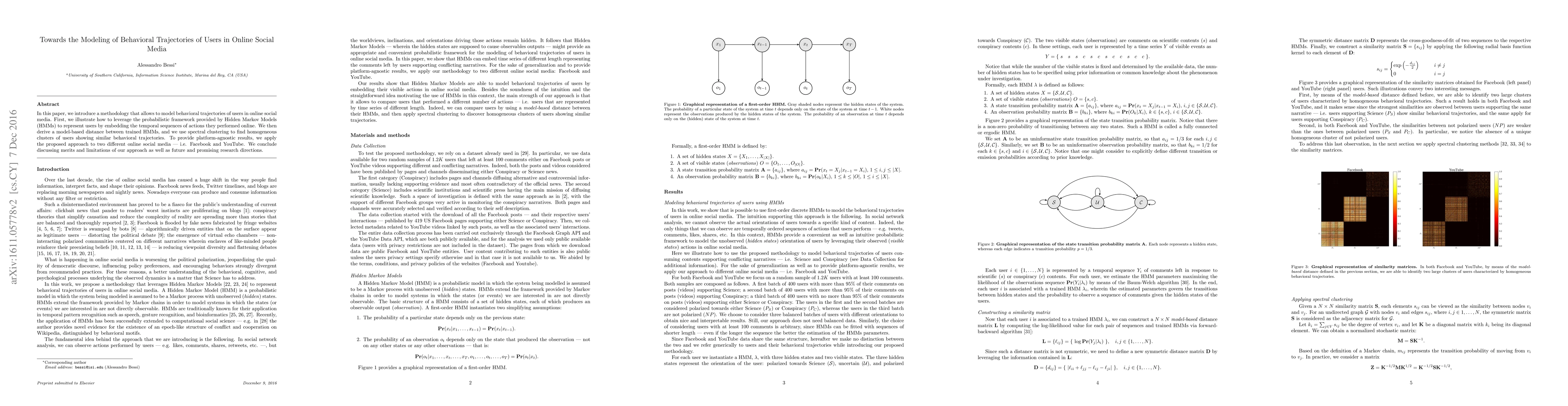 In this paper, we introduce a methodology that allows to model behavioral trajectories of users in online social media. First, we illustrate how to leverage the probabilistic framework provided by Hidden Markov Models (HMMs) to represent users by embedding the temporal sequences of actions they performed online. We then derive a model-based distance between trained HMMs, and we use spectral clustering to find homogeneous clusters of users showing similar behavioral trajectories. To provide platform-agnostic results, we apply the proposed approach to two different online social media --- i.e. Facebook and YouTube. We conclude discussing merits and limitations of our approach as well as future and promising research directions.