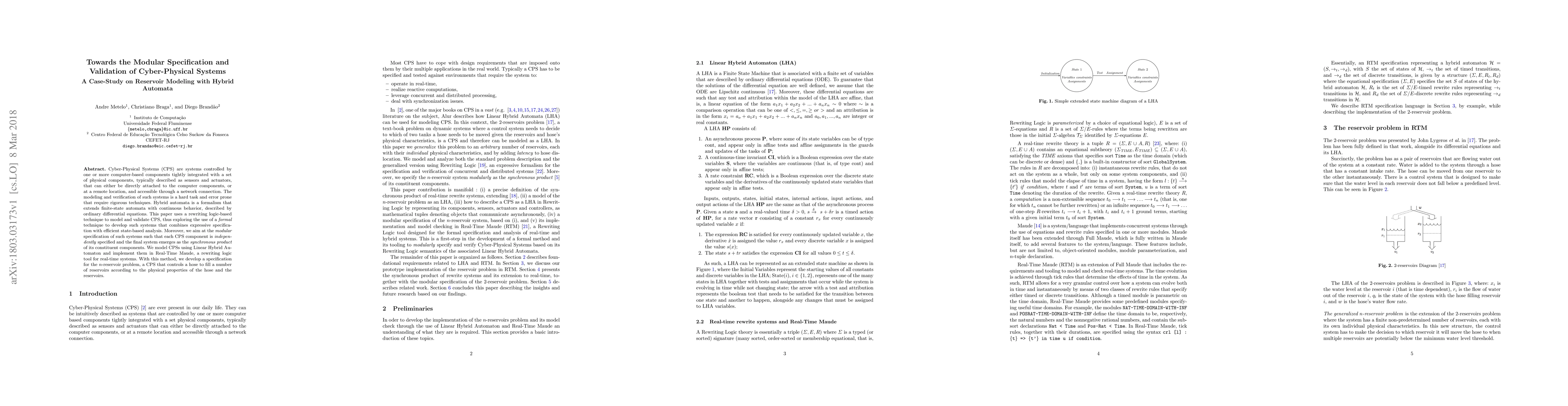 Cyber-Physical Systems (CPS) are systems controlled by one or more computer-based components tightly integrated with a set of physical components, typically described as sensors and actuators, that can either be directly attached to the computer components, or at a remote location, and accessible through a network connection. The modeling and verification of such systems is a hard task and error prone that require rigorous techniques. Hybrid automata is a formalism that extends finite-state automata with continuous behavior, described by ordinary differential equations. This paper uses a rewriting logic-based technique to model and validate CPS, thus exploring the use of a formal technique to develop such systems that combines expressive specification with efficient state-based analysis. Moreover, we aim at the modular specification of such systems such that each CPS component is independently specified and the final system emerges as the synchronous product of its constituent components. We model CPSs using Linear Hybrid Automaton and implement them in Real-Time Maude, a rewriting logic tool for real-time systems. With this method, we develop a specification for the $n$-reservoir problem, a CPS that controls a hose to fill a number of reservoirs according to the physical properties of the hose and the reservoirs.