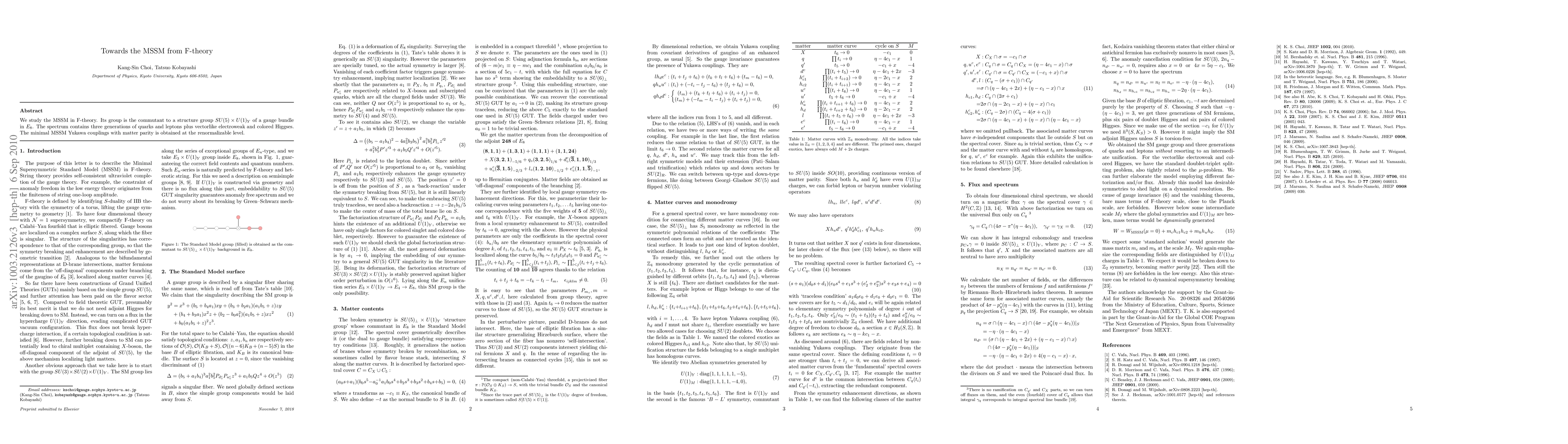 This paper explores how F-theory can help create a minimal Supersymmetric Standard Model (MSSM) with three generations of quarks and leptons and vector-like Higgses. It achieves this by identifying a gauge bundle in E8 that generates the desired MSSM spectrum.