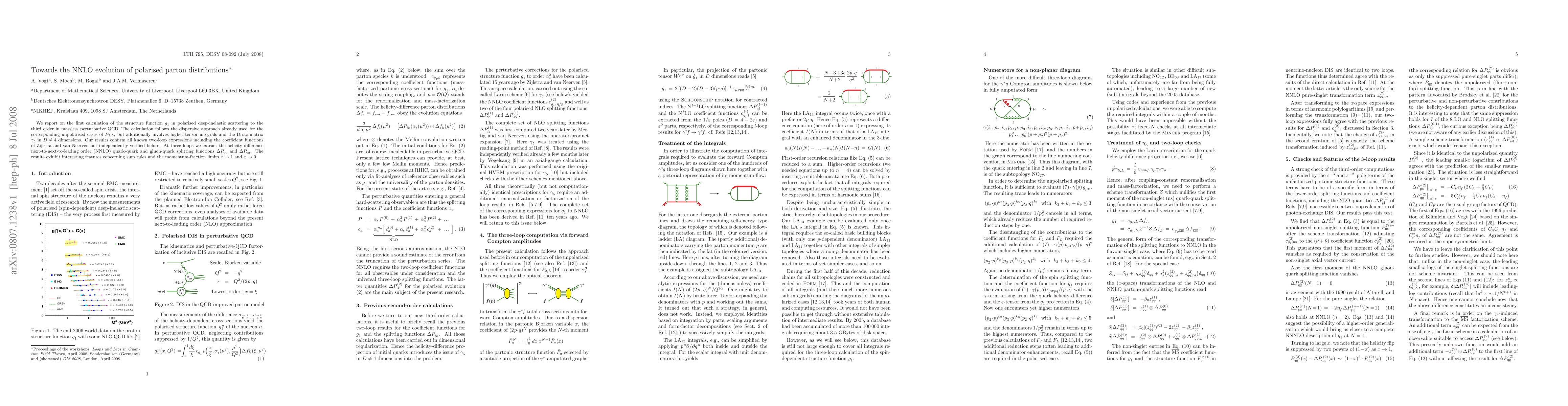We report on the first calculation of the structure function g_1 in polarised deep-inelastic scattering to the third order in massless perturbative QCD. The calculation follows the dispersive approach already used for the corresponding unpolarised cases of F_2,L, but additionally involves higher tensor integrals and the Dirac matrix gamma_5 in D unequal 4 dimensions. Our results confirm all known two-loop expressions including the coefficient functions of Zijlstra and van Neerven not independently verified before. At three loops we extract the helicity-difference next-to-next-to-leading order (NNLO) quark-quark and gluon-quark splitting functions Delta P_qq and Delta P_qg. The results exhibit interesting features concerning sum rules and the momentum-fraction limits x to 1 and x to 0.