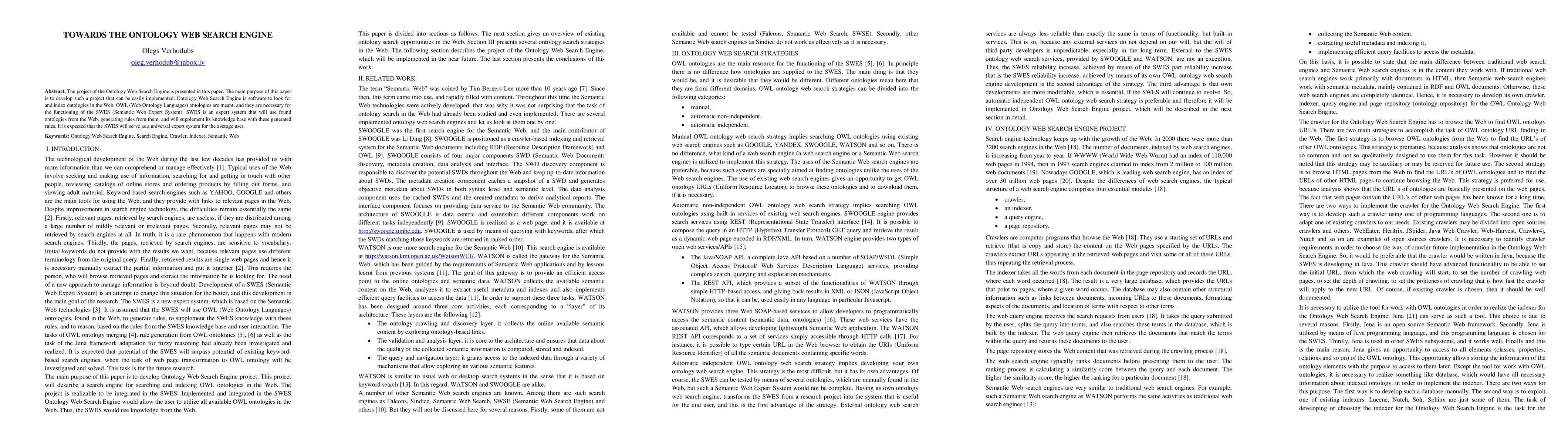 The project of the Ontology Web Search Engine is presented in this paper. The main purpose of this paper is to develop such a project that can be easily implemented. Ontology Web Search Engine is software to look for and index ontologies in the Web. OWL (Web Ontology Languages) ontologies are meant, and they are necessary for the functioning of the SWES (Semantic Web Expert System). SWES is an expert system that will use found ontologies from the Web, generating rules from them, and will supplement its knowledge base with these generated rules. It is expected that the SWES will serve as a universal expert system for the average user.