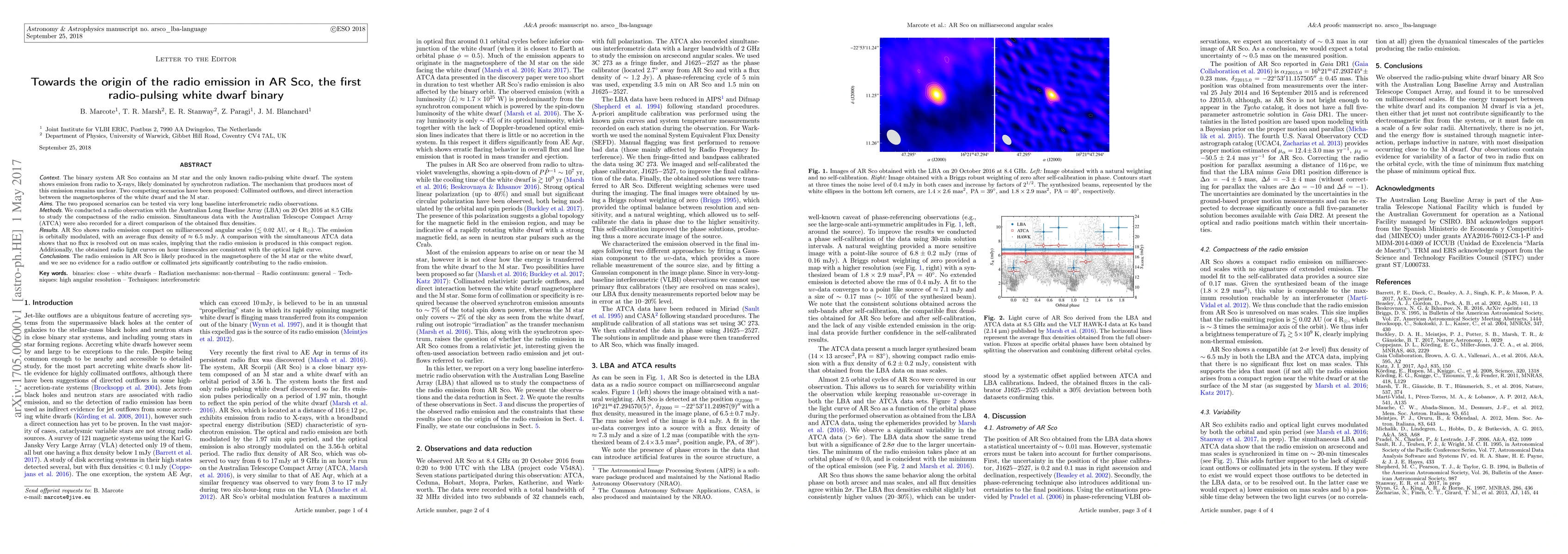 The radio emission in the binary system AR Sco, featuring the first radio-pulsing white dwarf, is compact and likely produced in the magnetosphere of the M star or the white dwarf, with no evidence for collimated outflows or jets. Observations using the Australian Long Baseline Array and the Australian Telescope Compact Array confirm the emission's orbital modulation and compact nature on milliarcsecond scales.