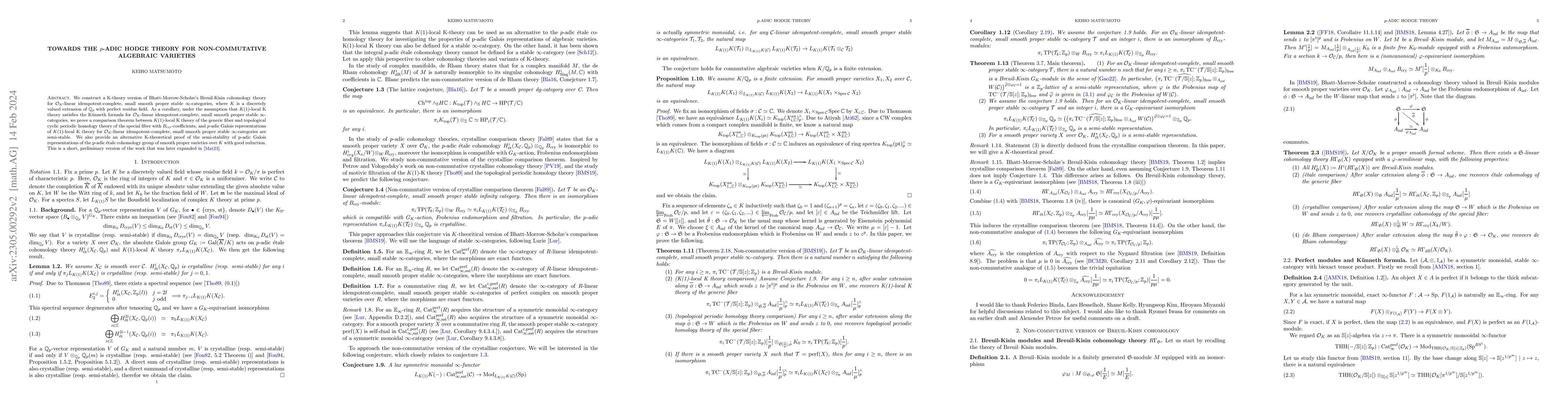 This paper constructs a K-theory version of Breuil-Kisin cohomology for non-commutative algebraic varieties over $p$-adic fields, proving a comparison theorem and establishing the semi-stability of $p$-adic Galois representations. The work serves as a preliminary version of a more extensive study.
