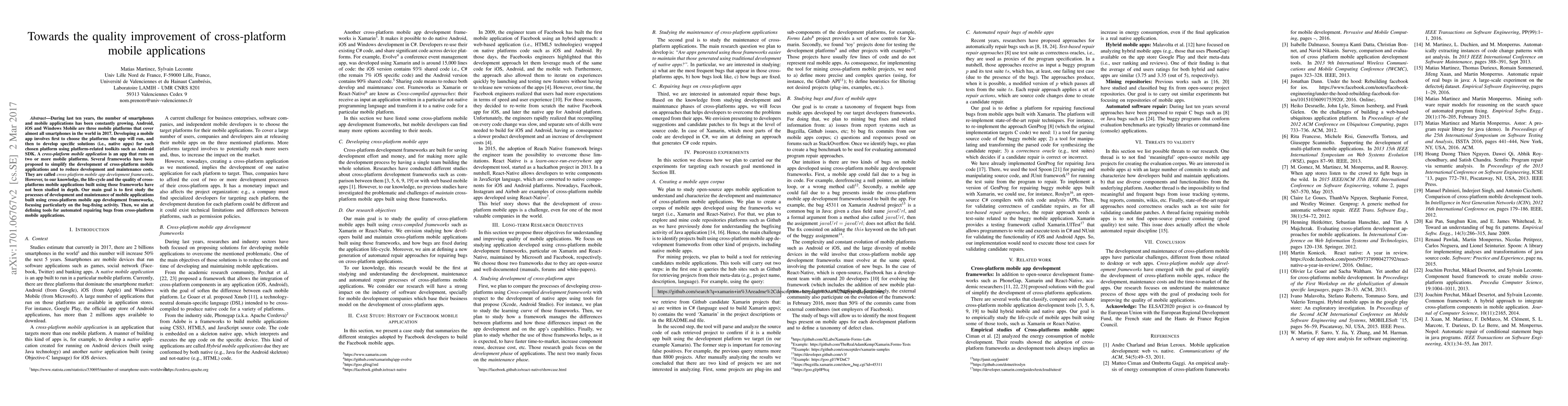 During last ten years, the number of smartphones and mobile applications has been constantly growing. Android, iOS and Windows Mobile are three mobile platforms that cover almost all smartphones in the world in 2017. Developing a mobile app involves first to choose the platforms the app will run, and then to develop specific solutions (i.e., native apps) for each chosen platform using platform-related toolkits such as AndroidSDK. Across-platform mobile application is an app that runs on two or more mobile platforms. Several frameworks have been proposed to simplify the development of cross-platform mobile applications and to reduce development and maintenance costs.They are called cross-platform mobile app development frameworks.However, to our knowledge, the life-cycle and the quality of cross-platforms mobile applications built using those frameworks have not been studied in depth. Our main goal is to first study the processes of development and maintenance of mobile applications built using cross-platform mobile app development frameworks, focusing particularly on the bug-fixing activity. Then, we aim at defining tools for automated repairing bugs from cross-platform mobile applications.