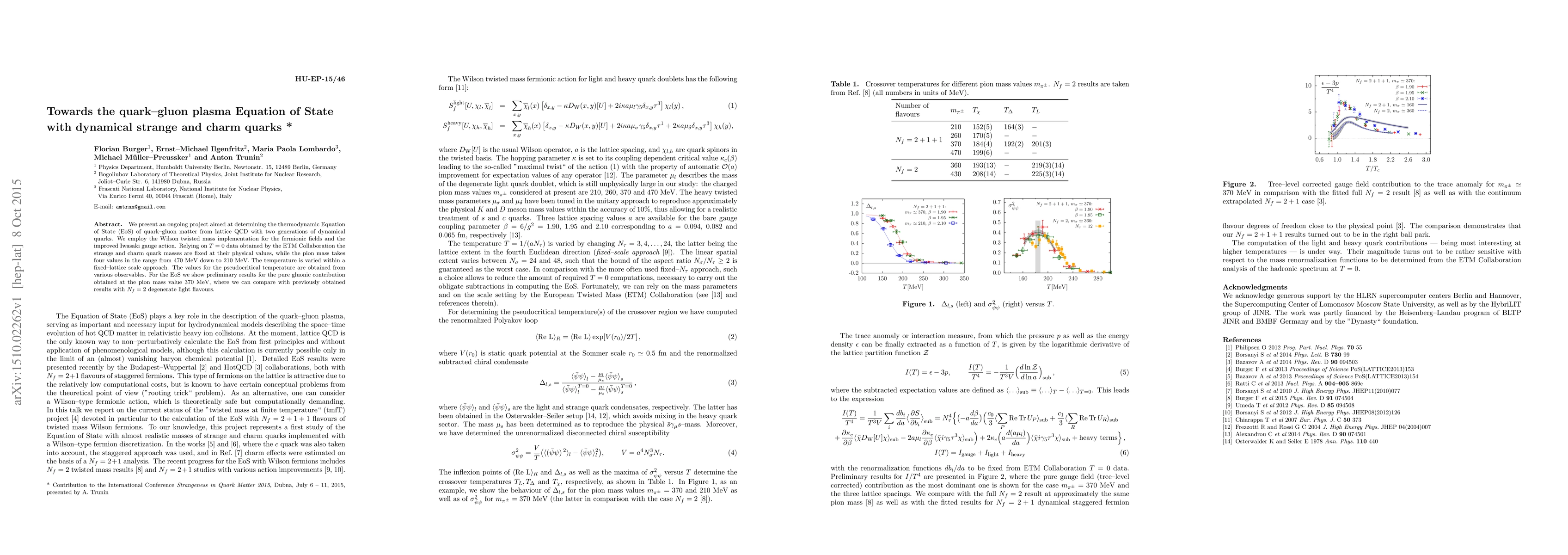 We present an ongoing project aimed at determining the thermodynamic Equation of State (EoS) of quark--gluon matter from lattice QCD with two generations of dynamical quarks. We employ the Wilson twisted mass implementation for the fermionic fields and the improved Iwasaki gauge action. Relying on $T=0$ data obtained by the ETM Collaboration the strange and charm quark masses are fixed at their physical values, while the pion mass takes four values in the range from 470 MeV down to 210 MeV. The temperature is varied within a fixed--lattice scale approach. The values for the pseudocritical temperature are obtained from various observables. For the EoS we show preliminary results for the pure gluonic contribution obtained at the pion mass value 370 MeV, where we can compare with previously obtained results with $N_f=2$ degenerate light flavours.