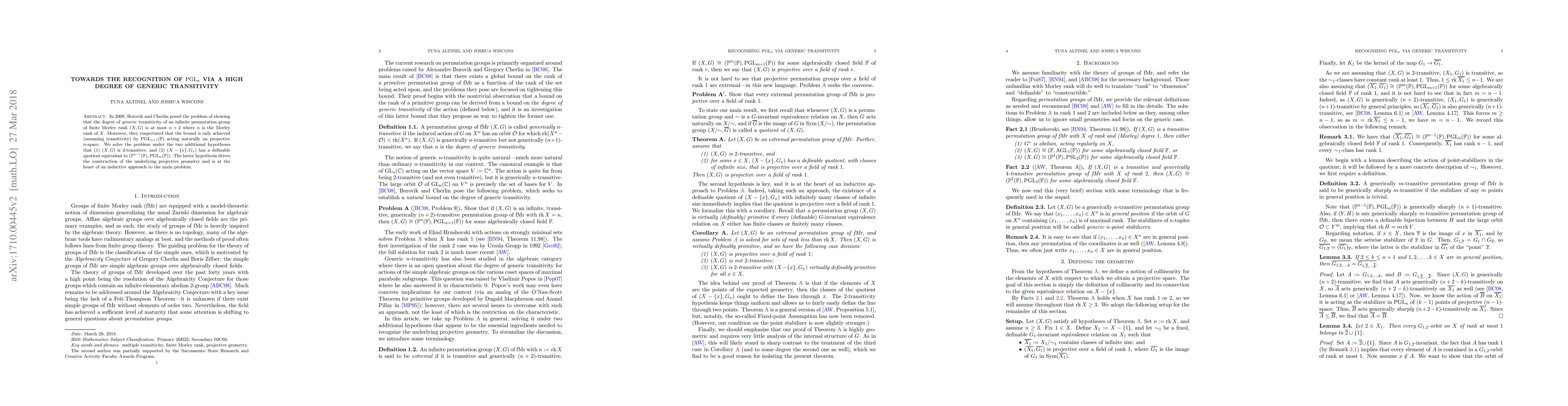 This paper solves a problem about recognizing the group PGL_n via high generic transitivity, with bounds on the degree of transitivity tied to n, the Morley rank of X. It achieves this under additional hypotheses, including 2-transitivity and definable quotient conditions.