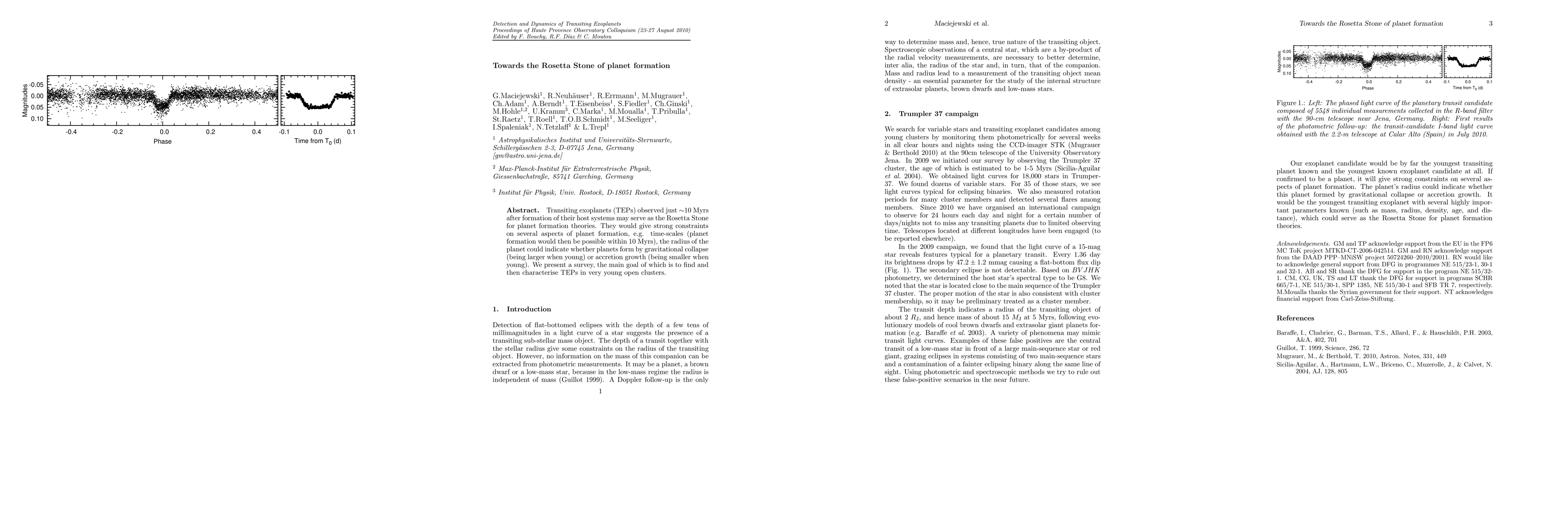 Transiting exoplanets (TEPs) observed just about 10 Myrs after formation of their host systems may serve as the Rosetta Stone for planet formation theories. They would give strong constraints on several aspects of planet formation, e.g. time-scales (planet formation would then be possible within 10 Myrs), the radius of the planet could indicate whether planets form by gravitational collapse (being larger when young) or accretion growth (being smaller when young). We present a survey, the main goal of which is to find and then characterise TEPs in very young open clusters.