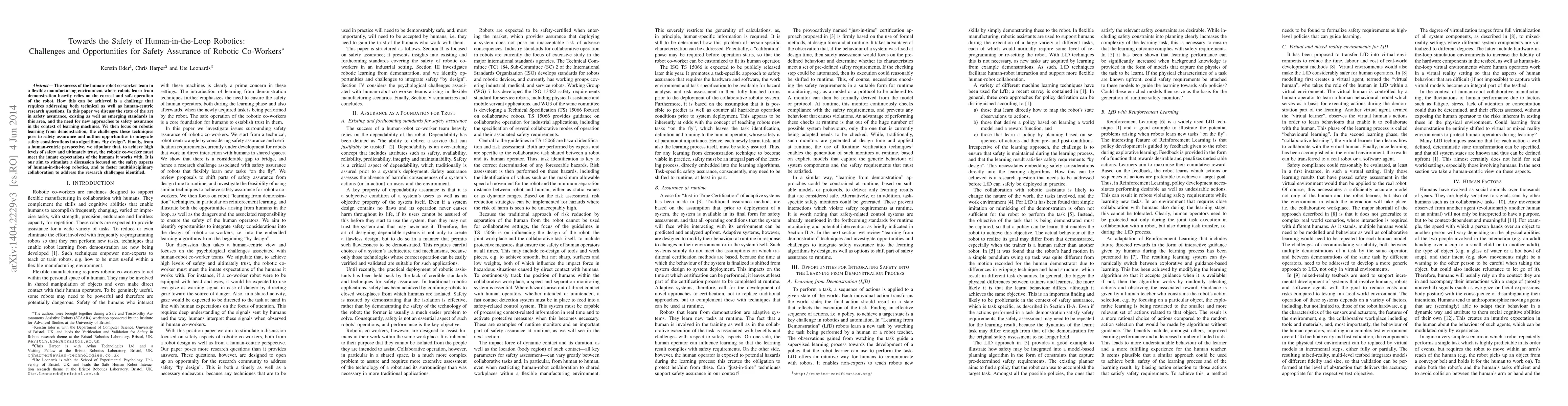This paper explores the challenges and opportunities for ensuring safety in human-robot co-worker teams, focusing on robotic learning from demonstration and the integration of safety into algorithms. It emphasizes the need for multidisciplinary collaboration to address safety assurance in human-in-the-loop robotics.