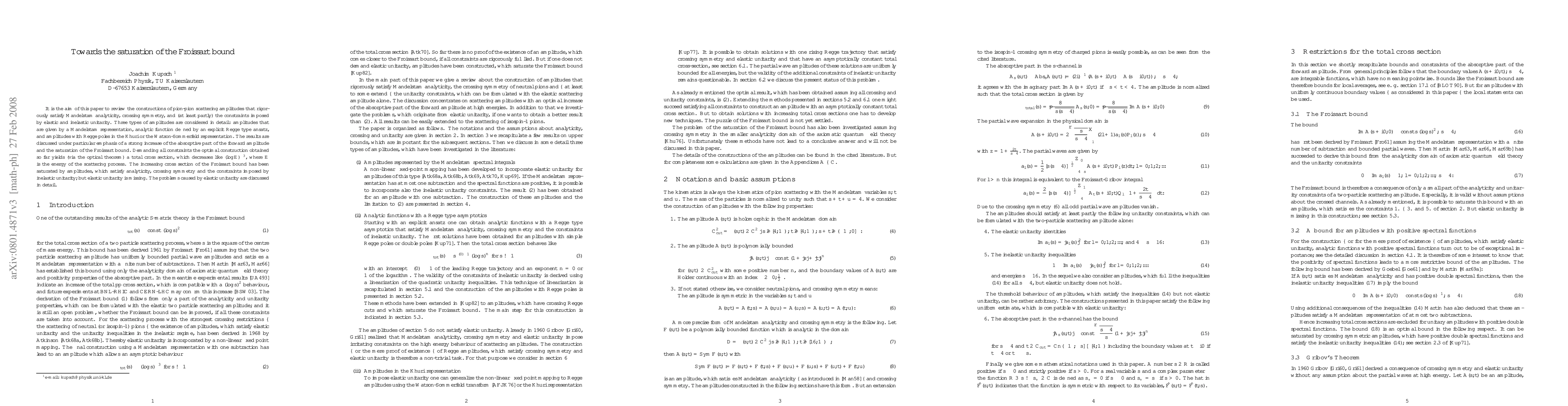 This paper presents constructions of amplitudes that meet Mandelstam analyticity, crossing symmetry, and unitarity constraints, highlighting a significant increase in the absorptive part of the forward amplitude and the saturation of the Froissart bound.