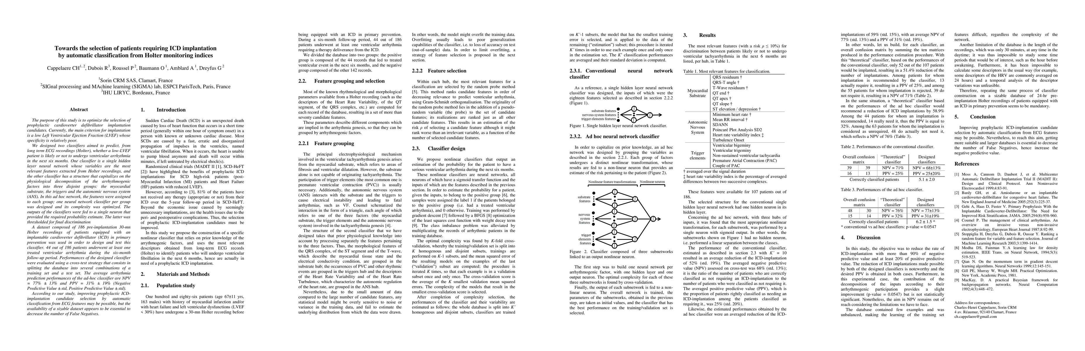 The purpose of this study is to optimize the selection of prophylactic cardioverter defibrillator implantation candidates. Currently, the main criterion for implantation is a low Left Ventricular Ejection Fraction (LVEF) whose specificity is relatively poor. We designed two classifiers aimed to predict, from long term ECG recordings (Holter), whether a low-LVEF patient is likely or not to undergo ventricular arrhythmia in the next six months. One classifier is a single hidden layer neural network whose variables are the most relevant features extracted from Holter recordings, and the other classifier has a structure that capitalizes on the physiological decomposition of the arrhythmogenic factors into three disjoint groups: the myocardial substrate, the triggers and the autonomic nervous system (ANS). In this ad hoc network, the features were assigned to each group; one neural network classifier per group was designed and its complexity was optimized. The outputs of the classifiers were fed to a single neuron that provided the required probability estimate. The latter was thresholded for final discrimination A dataset composed of 186 pre-implantation 30-mn Holter recordings of patients equipped with an implantable cardioverter defibrillator (ICD) in primary prevention was used in order to design and test this classifier. 44 out of 186 patients underwent at least one treated ventricular arrhythmia during the six-month follow-up period. Performances of the designed classifier were evaluated using a cross-test strategy that consists in splitting the database into several combinations of a training set and a test set. The average arrhythmia prediction performances of the ad-hoc classifier are NPV = 77% $\pm$ 13% and PPV = 31% $\pm$ 19% (Negative Predictive Value $\pm$ std, Positive Predictive Value $\pm$ std). According to our study, improving prophylactic ICD-implantation candidate selection by automatic classification from ECG features may be possible, but the availability of a sizable dataset appears to be essential to decrease the number of False Negatives.