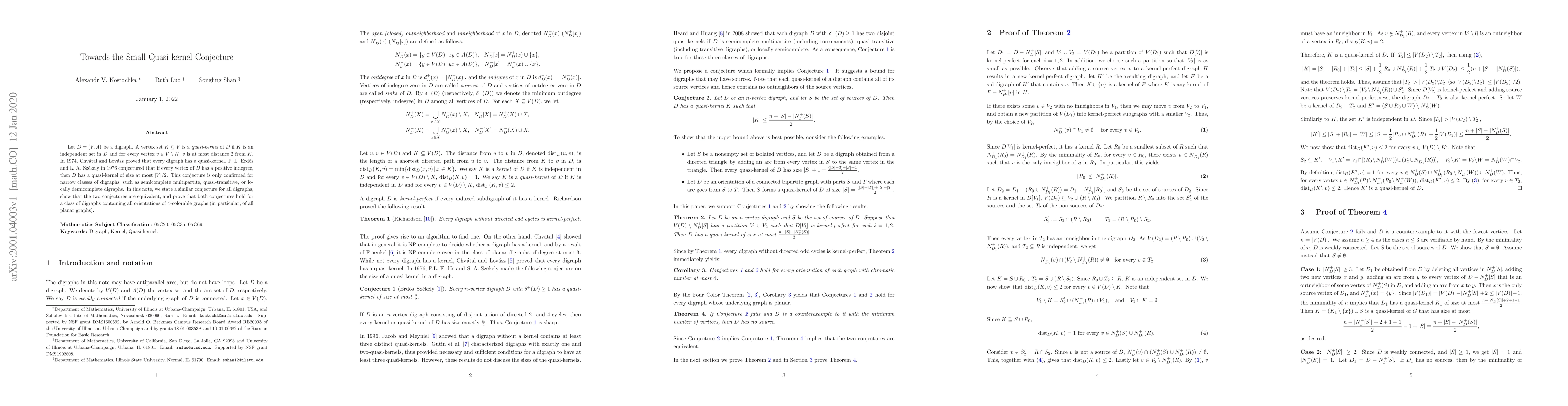Researchers prove a conjecture about digraphs, showing that a class of 4-colorable graphs has a quasi-kernel with size at most |V|/2, aligning with a previously confirmed conjecture for narrower classes.