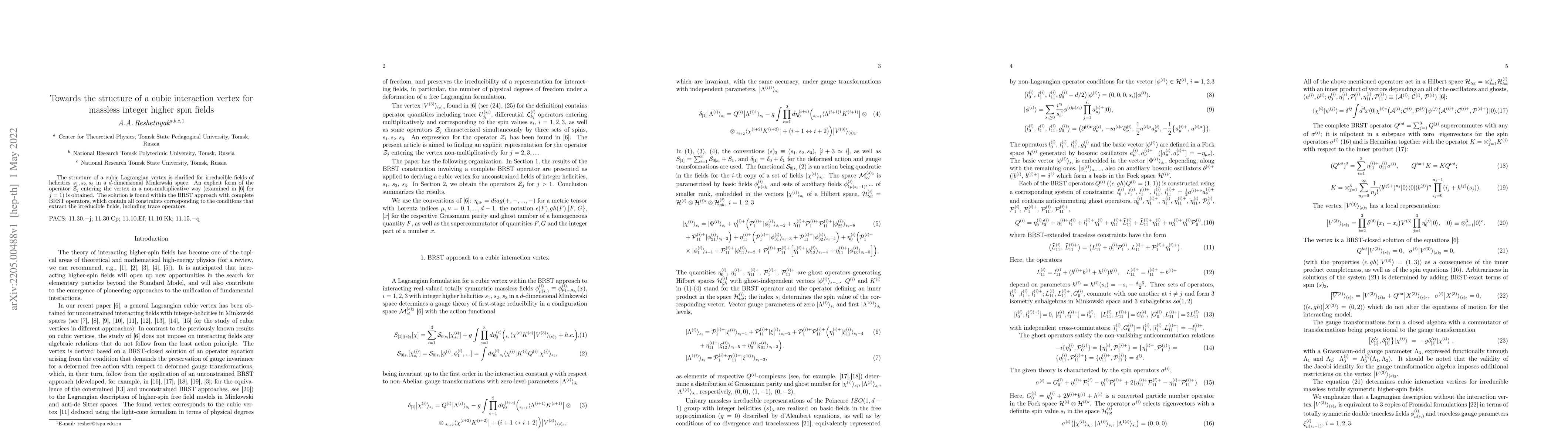 This paper clarifies the cubic Lagrangian vertex structure for massless integer higher spin fields in $d$-dimensional Minkowski space, obtaining an explicit form for the operator $\mathcal{Z}_j$. The solution is derived using the BRST approach with complete BRST operators to extract irreducible fields.