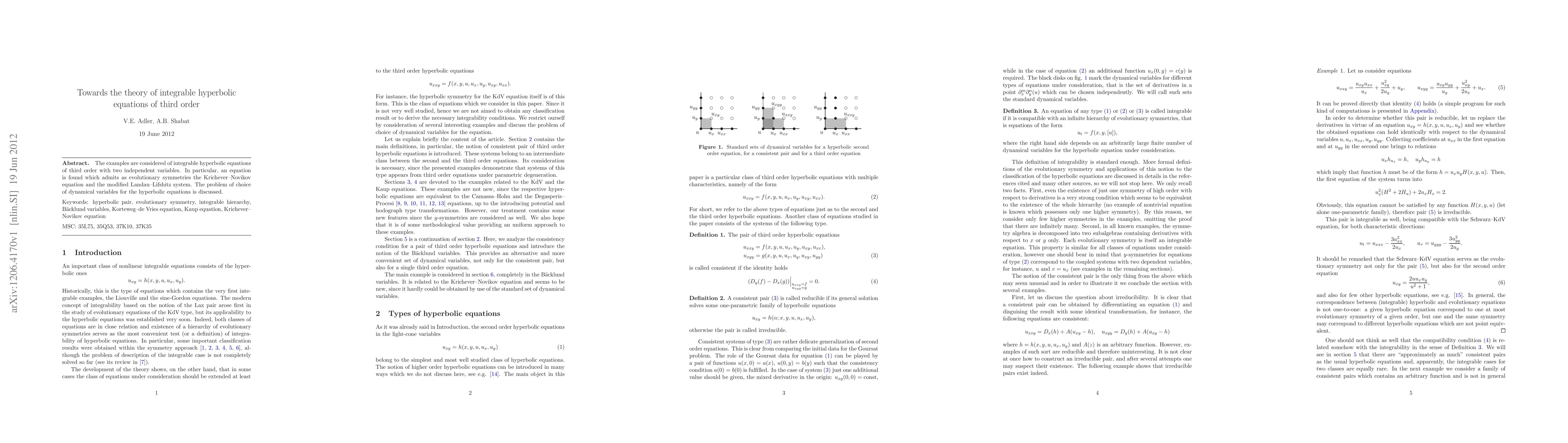The paper explores integrable hyperbolic equations of third order with two independent variables, identifying an equation that includes the Krichever-Novikov and modified Landau-Lifshitz systems as evolutionary symmetries, and discusses the selection of appropriate dynamical variables.