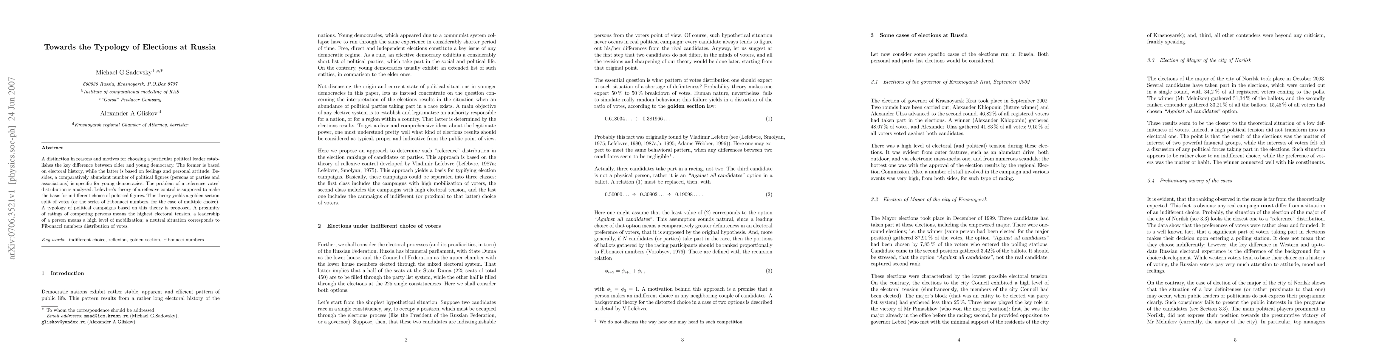 A distinction in reasons and motives for choosing a particular political leader establishes the key difference between older and young democracy. The former is based on electoral history, while the latter is based on feelings and personal attitude. Besides, a comparatively abundant number of political figures (persons or parties and associations) is specific for young democracies. The problem of a reference votes' distribution is analyzed. Lefevbre's theory of a reflexive control is supposed to make the basis for indifferent choice of political figures. This theory yields a golden section split of votes (or the series of Fibonacci numbers, for the case of multiple choice). A typology of political campaigns based on this theory is proposed. A proximity of ratings of competing persons means the highest electoral tension, a leadership of a person means a high level of mobilization; a neutral situation corresponds to Fibonacci numbers distribution of votes.