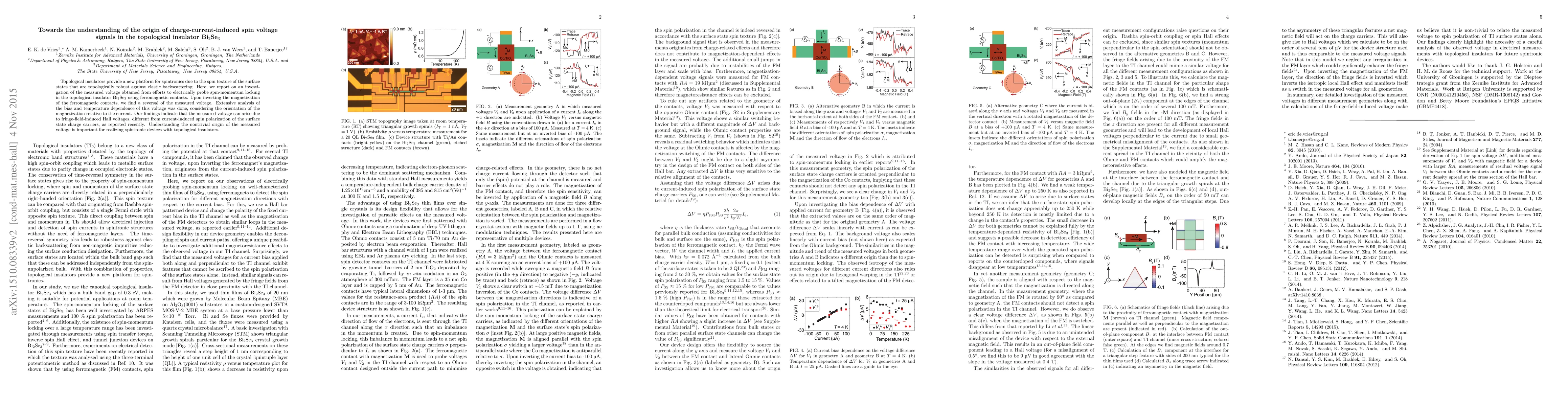 This paper investigates the origin of charge-current-induced spin voltage signals in the topological insulator Bi$_2$Se$_3$, revealing that the measured voltage results from fringe-field-induced Hall voltages rather than current-induced spin polarization, which is crucial for developing spintronic devices based on topological insulators.