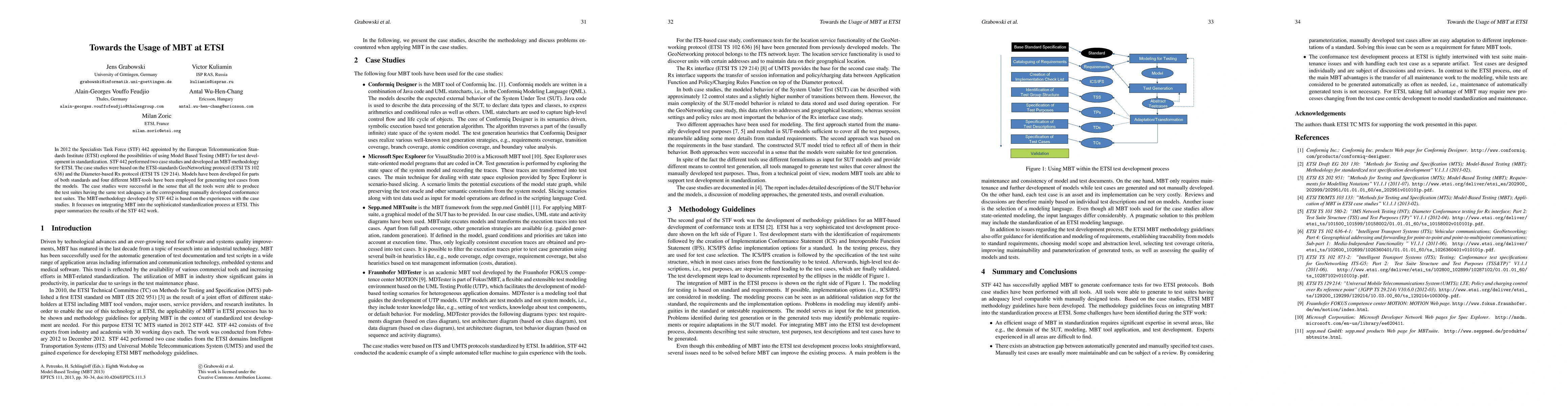 In 2012 the Specialists Task Force (STF) 442 appointed by the European Telcommunication Standards Institute (ETSI) explored the possibilities of using Model Based Testing (MBT) for test development in standardization. STF 442 performed two case studies and developed an MBT-methodology for ETSI. The case studies were based on the ETSI-standards GeoNetworking protocol (ETSI TS 102 636) and the Diameter-based Rx protocol (ETSI TS 129 214). Models have been developed for parts of both standards and four different MBT-tools have been employed for generating test cases from the models. The case studies were successful in the sense that all the tools were able to produce the test suites having the same test adequacy as the corresponding manually developed conformance test suites. The MBT-methodology developed by STF 442 is based on the experiences with the case studies. It focusses on integrating MBT into the sophisticated standardization process at ETSI. This paper summarizes the results of the STF 442 work.