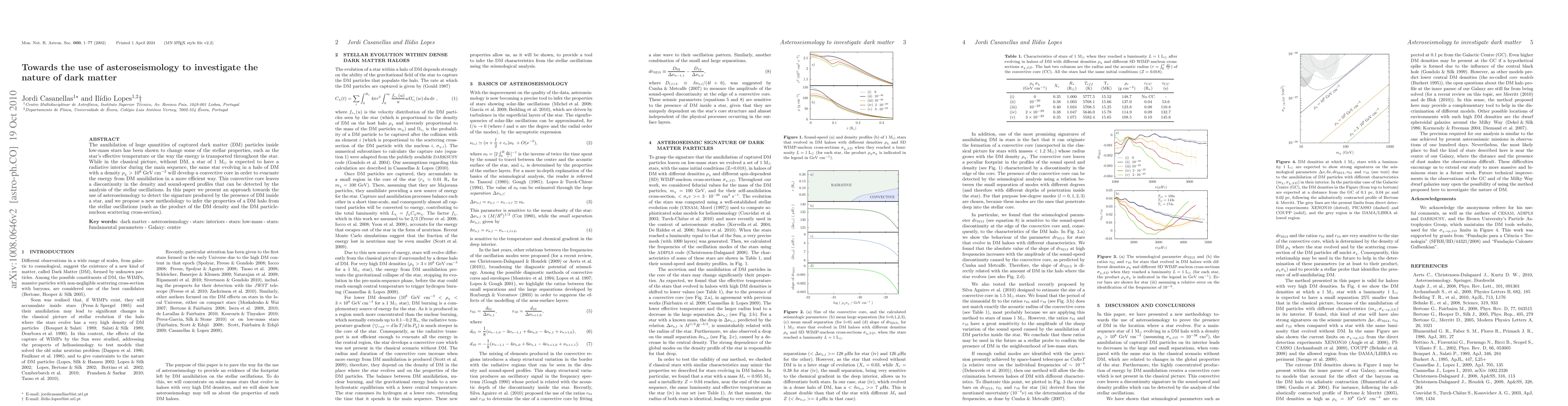 The annihilation of huge quantities of captured dark matter (DM) particles inside low-mass stars has been shown to change some of the stellar properties, such as the star's effective temperature or the way the energy is transported throughout the star. While in the classical picture, without DM, a star of 1 M_sun is expected to have a radiative interior during the main sequence, the same star evolving in a halo of DM with a density rho_x > 10^8 GeV cm^-3 will develop a convective core in order to evacuate the energy from DM annihilation in a more efficient way. This convective core leaves a discontinuity in the density and sound-speed profiles that can be detected by the analysis of the stellar oscillations. In this paper we present an approach towards the use of asteroseismology to detect the signature produced by the presence of DM inside a star, and we propose a new methodology to infer the properties of a DM halo from the stellar oscillations (such as the product of the DM density and the DM particle-nucleon scattering cross-section).