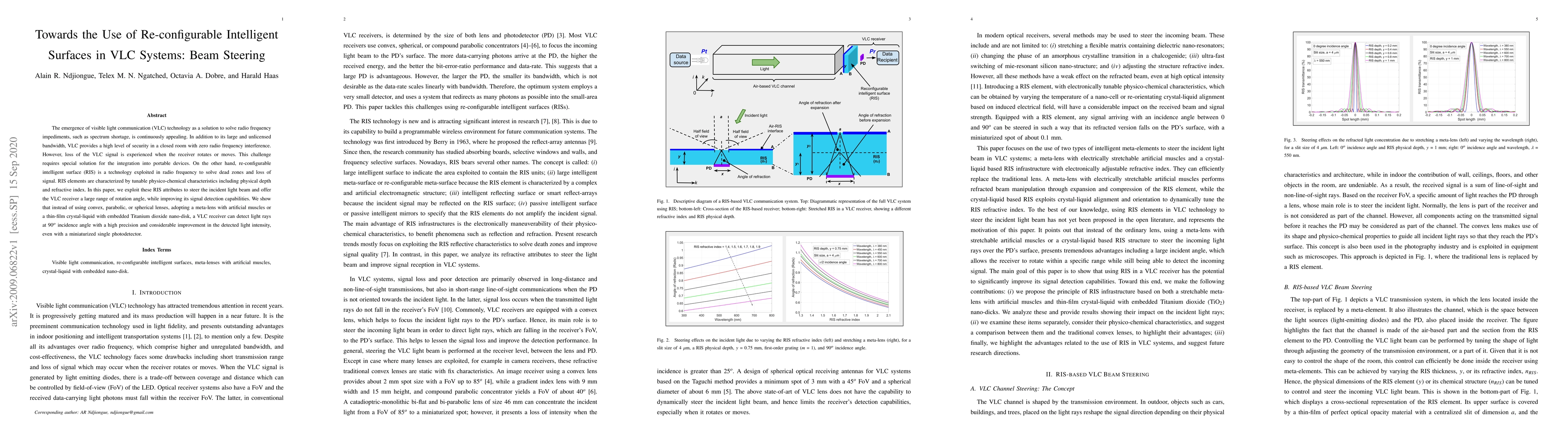 The emergence of visible light communication (VLC) technology as a solution to solve radio frequency impediments, such as spectrum shortage, is continuously appealing. In addition to its large and unlicensed bandwidth, VLC provides a high level of security in a closed room with zero radio frequency interference. However, loss of the VLC signal is experienced when the receiver rotates or moves. This challenge requires a special solution for integration into portable devices. On the other hand, re-configurable intelligent surface (RIS) is a technology exploited in radio frequency to solve dead zones and loss of signal. RIS elements are characterized by tunable physico-chemical characteristics including physical depth and refractive index. In this paper, we exploit these RIS attributes to steer the incident light beam and offer the VLC receiver a large range of rotation angle while improving its signal detection capabilities. We show that instead of using convex, parabolic, or spherical lenses, adopting a meta-lens with artificial muscles or a thin-film crystal-liquid with embedded Titanium dioxide nano-disk, a VLC receiver can detect light rays at $90^o$ incidence angle with high precision and considerable improvement in the detected light intensity, even with a miniaturized single photodetector.