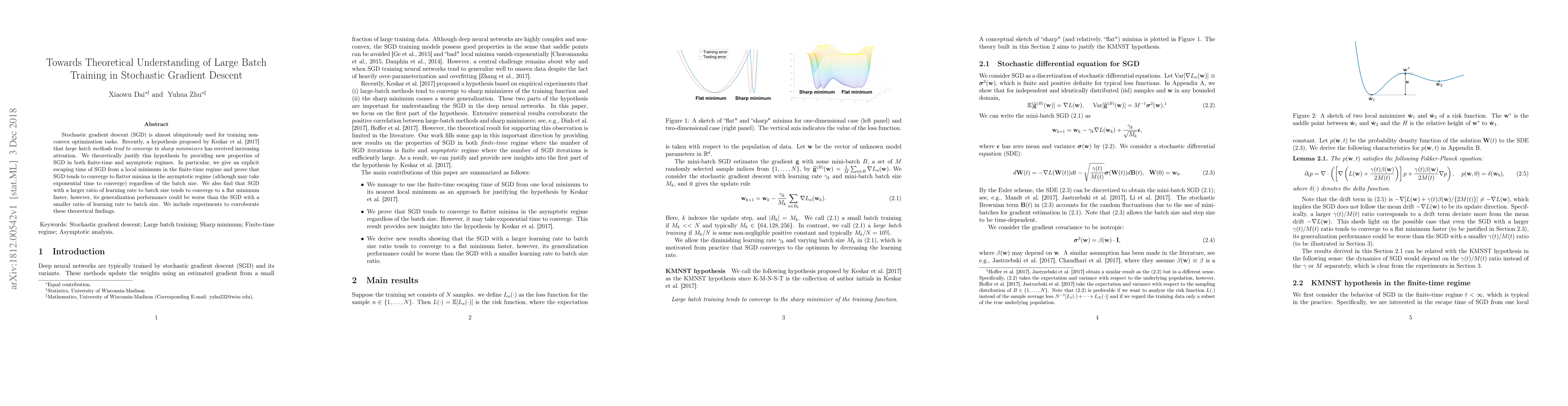 Stochastic gradient descent (SGD) is almost ubiquitously used for training non-convex optimization tasks. Recently, a hypothesis proposed by Keskar et al. [2017] that large batch methods tend to converge to sharp minimizers has received increasing attention. We theoretically justify this hypothesis by providing new properties of SGD in both finite-time and asymptotic regimes. In particular, we give an explicit escaping time of SGD from a local minimum in the finite-time regime and prove that SGD tends to converge to flatter minima in the asymptotic regime (although may take exponential time to converge) regardless of the batch size. We also find that SGD with a larger ratio of learning rate to batch size tends to converge to a flat minimum faster, however, its generalization performance could be worse than the SGD with a smaller ratio of learning rate to batch size. We include numerical experiments to corroborate these theoretical findings.
