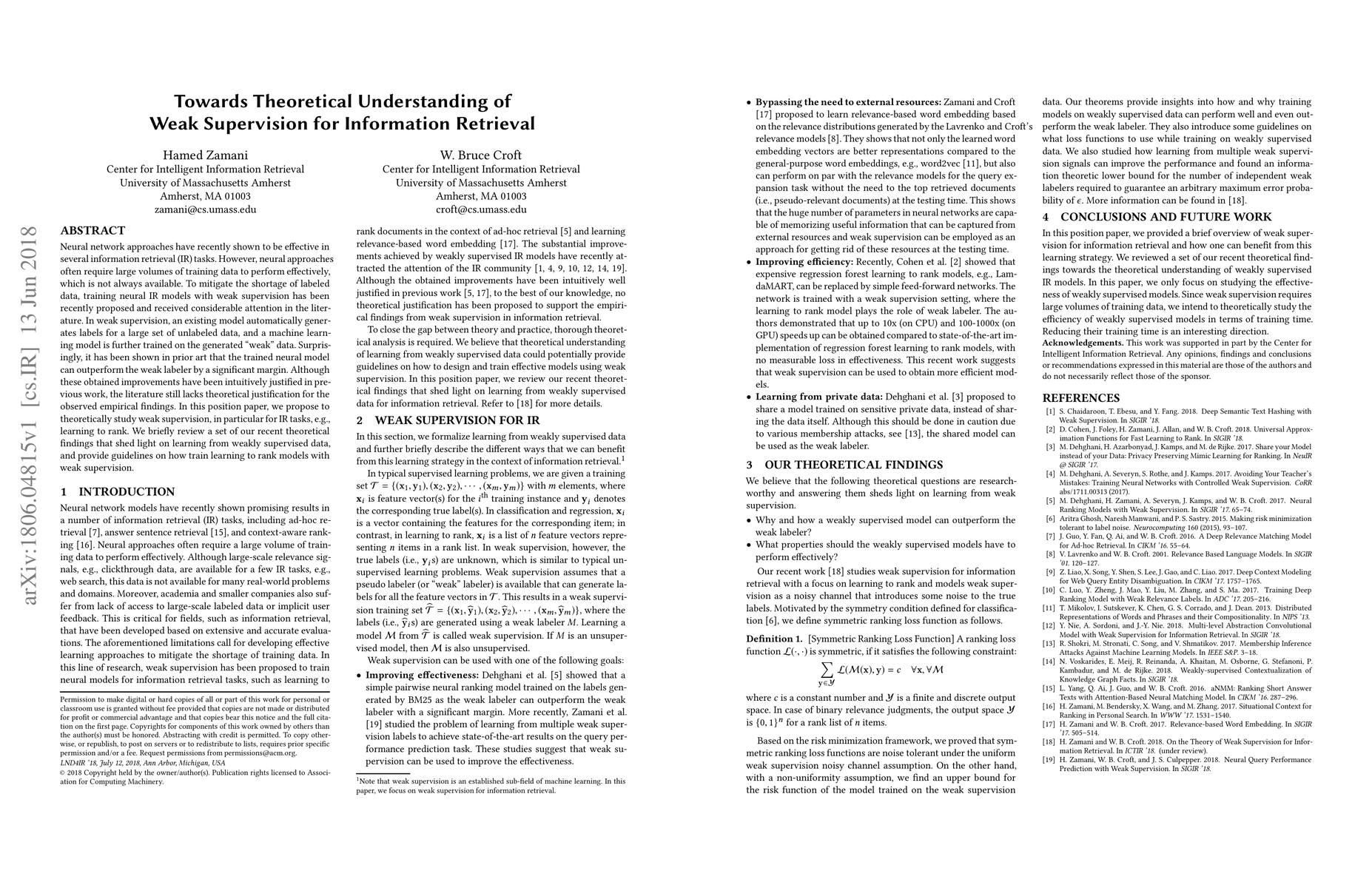 Theoretical framework for understanding weak supervision in IR, including symmetric ranking loss functions and noise-tolerant properties.