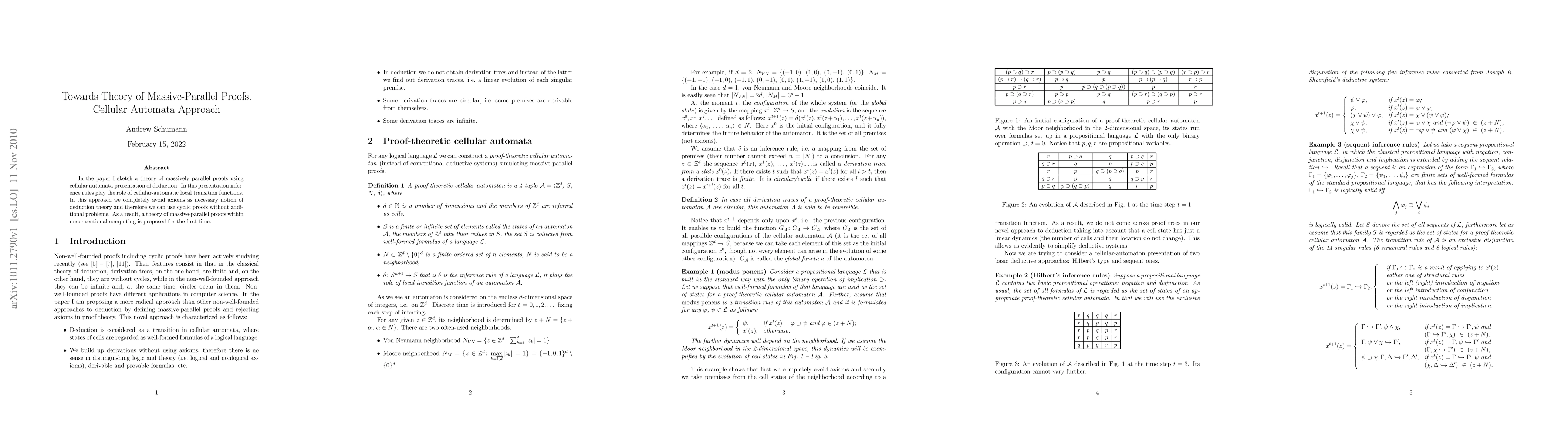 This paper proposes a novel theory of massively parallel proofs using cellular automata, where inference rules function as local transition functions. By eschewing axioms, the theory accommodates cyclic proofs, leading to a groundbreaking theory of parallel proofs in unconventional computing.