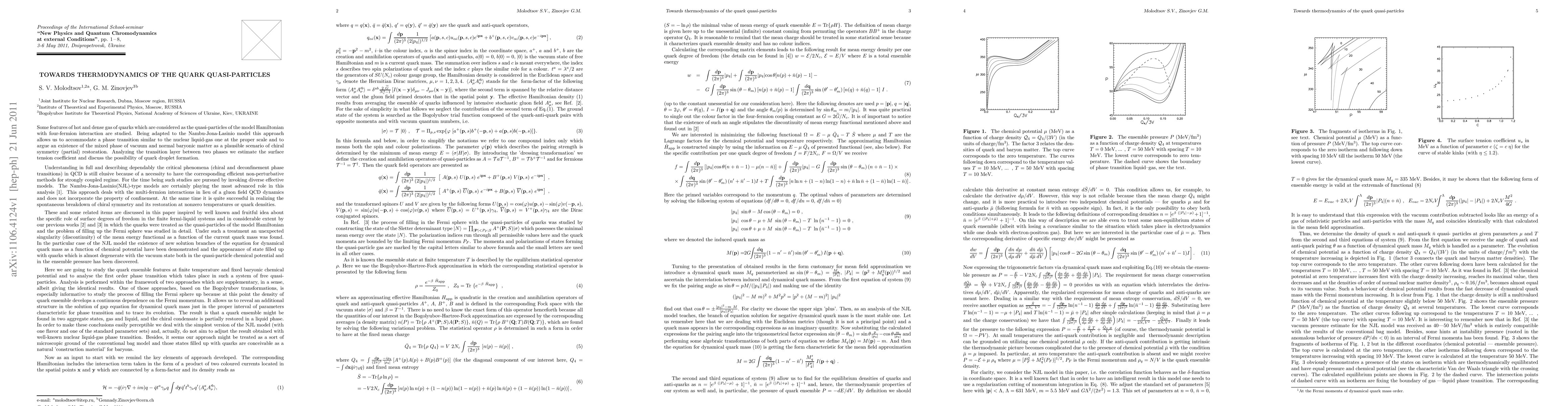 Some features of hot and dense gas of quarks which are considered as the quasi-particles of the model Hamiltonian with four-fermion interaction are studied. Being adapted to the Nambu-Jona-Lasinio model this approach allows us to accommodate a phase transition similar to the nuclear liquid-gas one at the proper scale and to argue an existence of the mixed phase of vacuum and normal baryonic matter as a plausible scenario of chiral symmetry (partial) restoration. Analyzing the transition layer between two phases we estimate the surface tension coefficient and discuss the possibility of quark droplet formation.