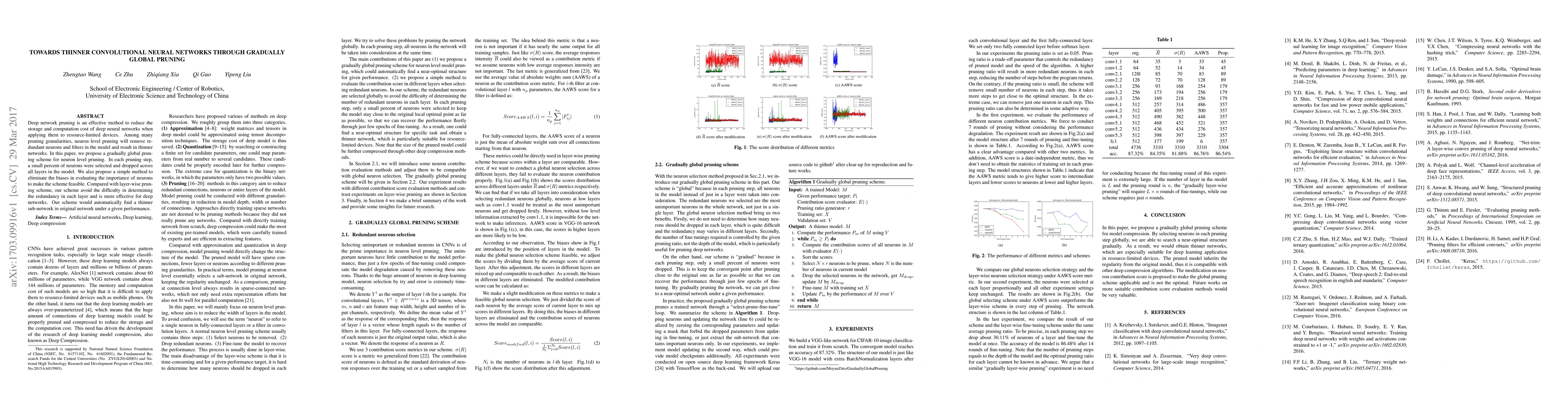 This paper proposes a gradually global pruning scheme for neuron level pruning in convolutional neural networks to create thinner models, reducing storage and computational costs. Unlike layer-wise pruning, this method selects and drops a small percentage of neurons across all layers, simplifying the determination of redundancy and achieving effective thinning while maintaining performance.