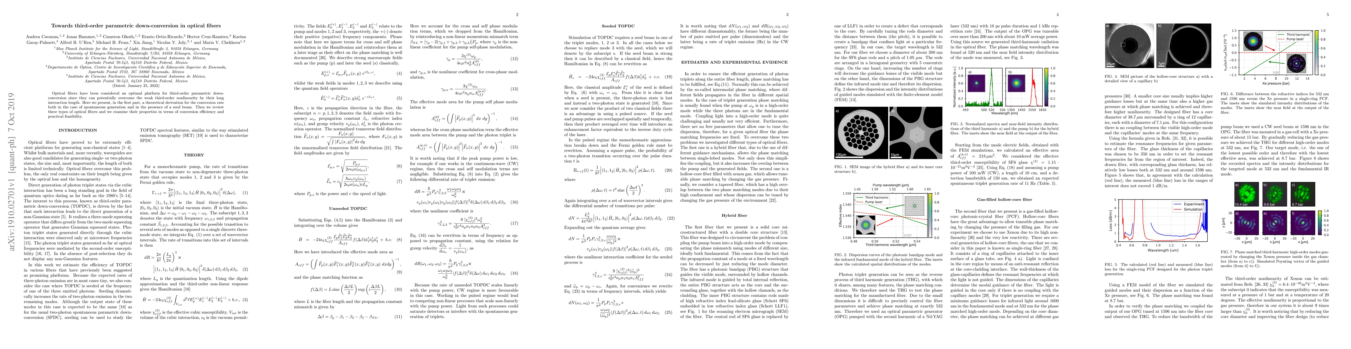 This paper theoretically explores third-order parametric down-conversion in optical fibers, proposing that their long interaction length can enhance conversion rates. It reviews three fiber types, assessing their efficiency and practical viability for this application.