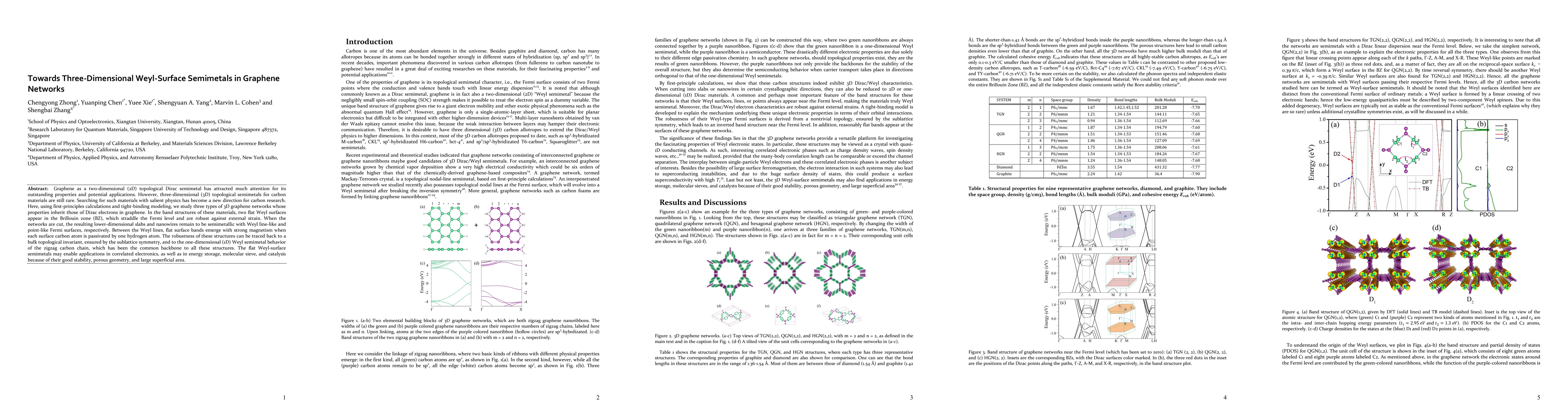 This paper explores three-dimensional graphene networks that exhibit Weyl-surface semimetal properties, inheriting the Dirac electron characteristics of graphene. These structures exhibit robust Weyl surfaces in their band structures, maintaining semimetallicity even in lower-dimensional forms, and show potential for applications in correlated electronics, energy storage, and catalysis due to their stability and porous structure.